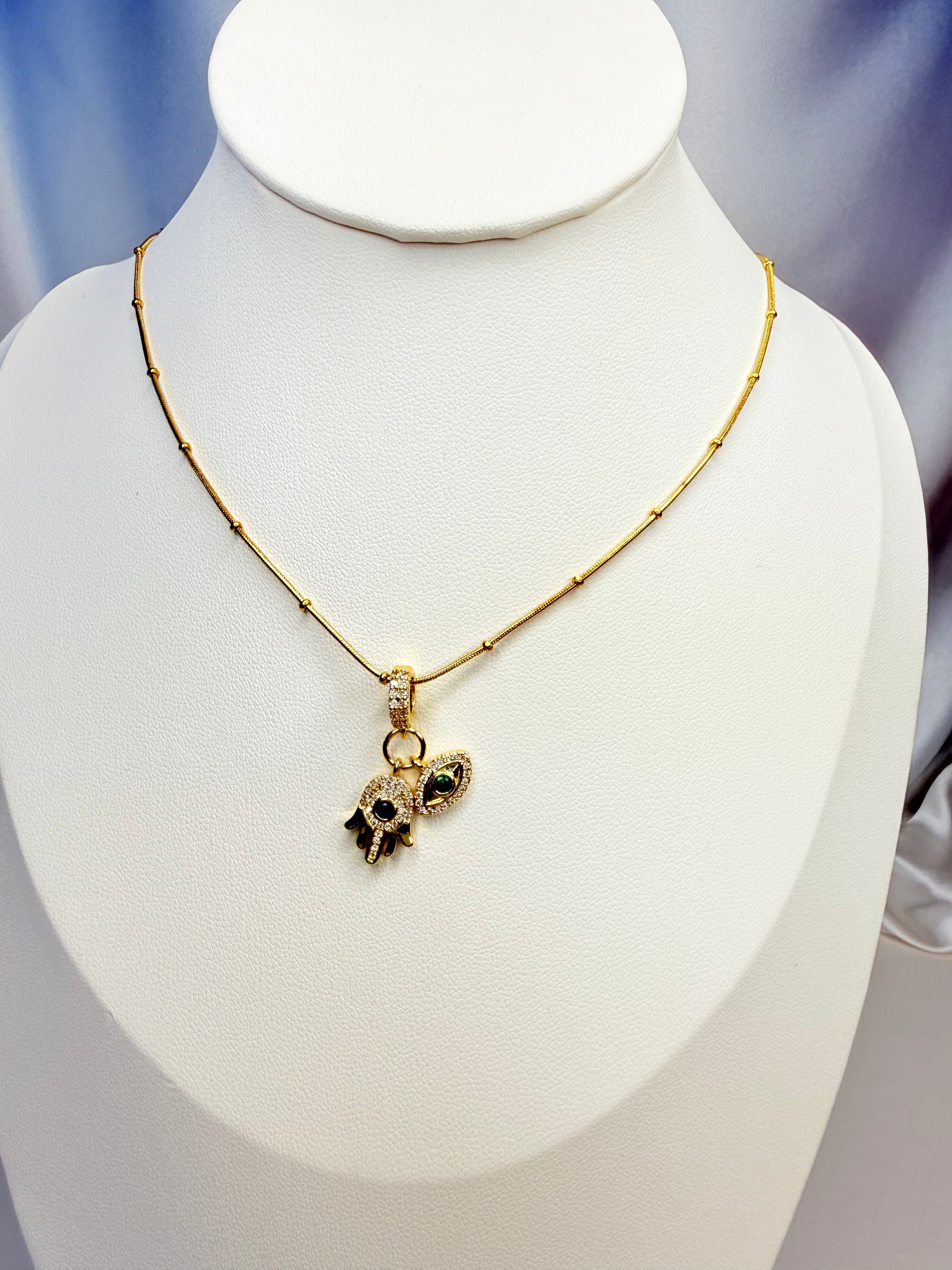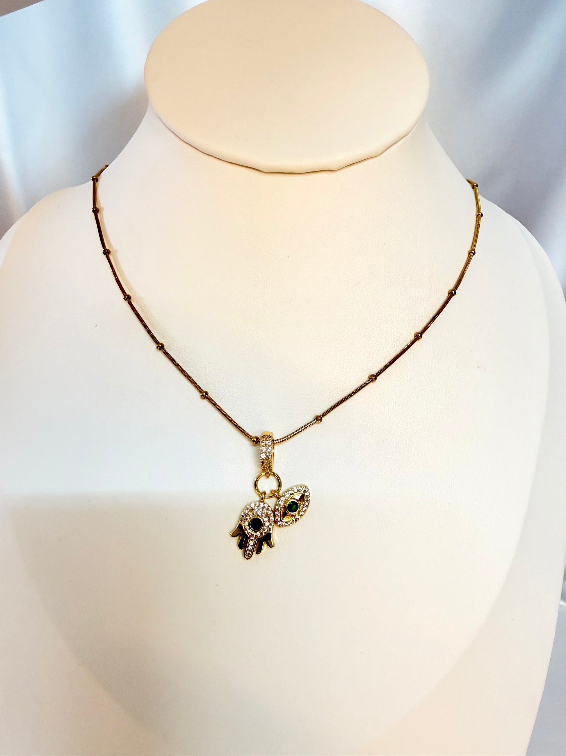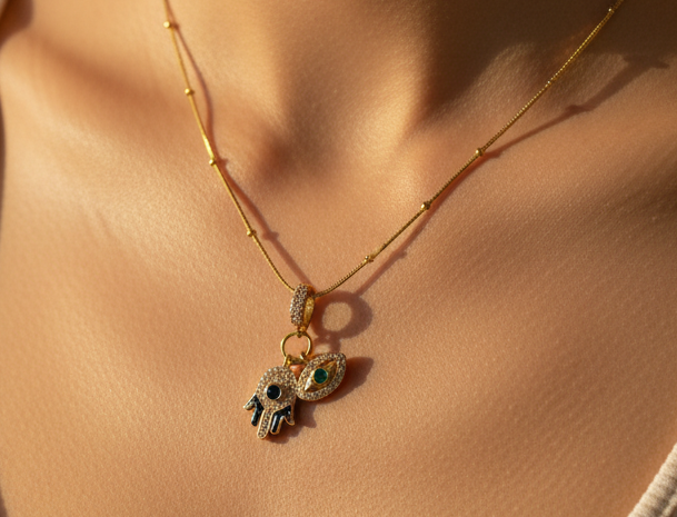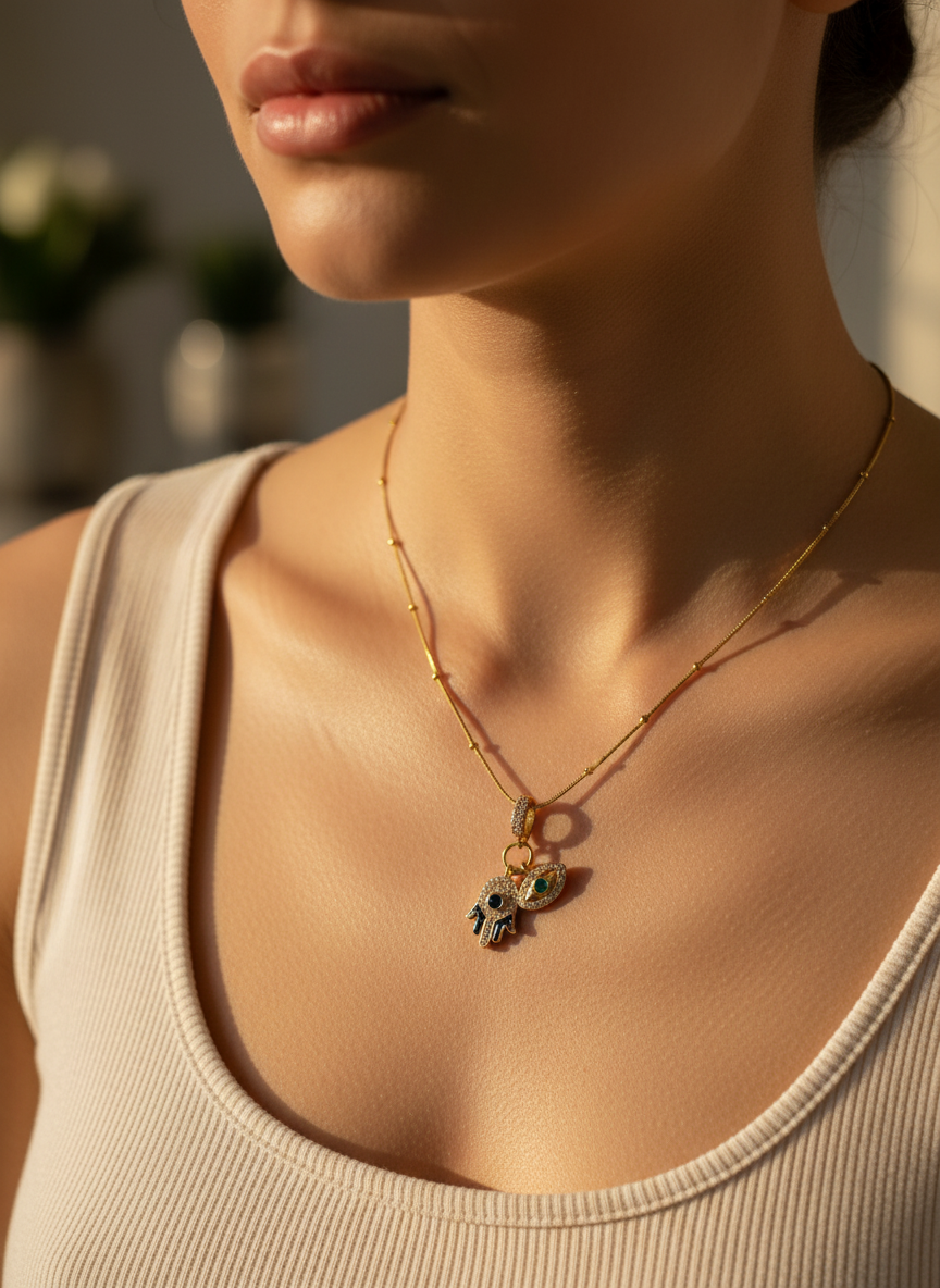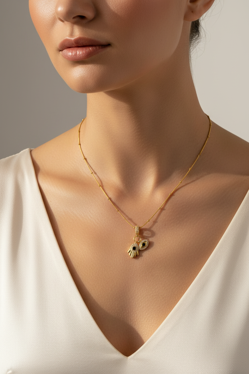 عقد ذهبي فاخر بتصميم راقٍ يجمع بين رمز العين ورمز الكف، مرصّع بأحجار لامعة مع لمسة سوداء أنيقة في مركز العين. قطعة تجمع بين الجمال والرمزية، لتمنحك إطلالة فاخرة تحمل معنى الحماية والطاقة الإيجابية.