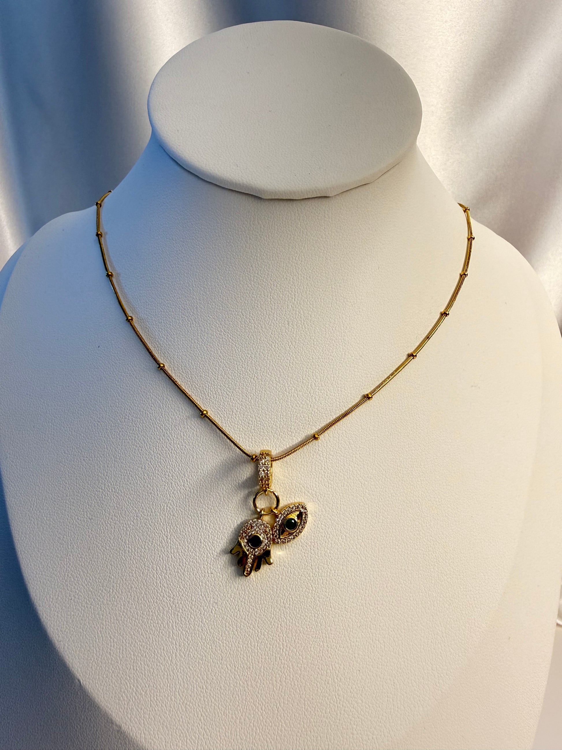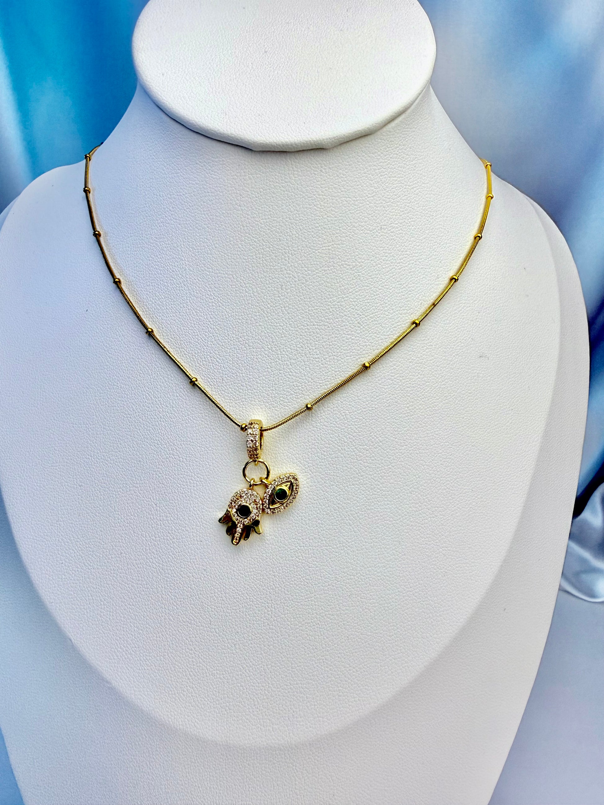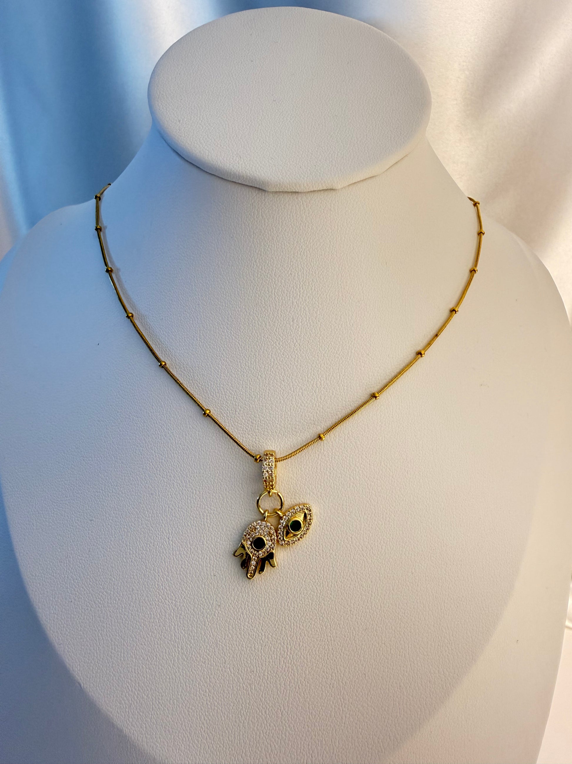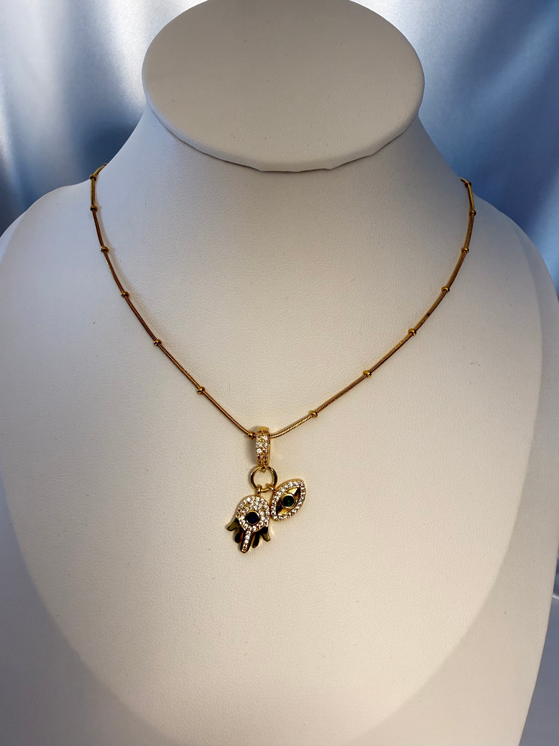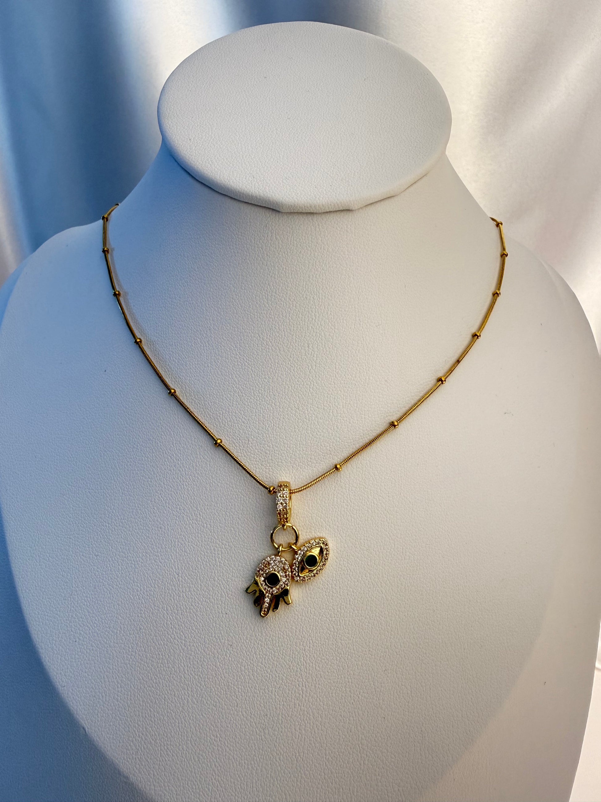 عقد ذهبي فاخر بتصميم راقٍ يجمع بين رمز العين ورمز الكف، مرصّع بأحجار لامعة مع لمسة سوداء أنيقة في مركز العين. قطعة تجمع بين الجمال والرمزية، لتمنحك إطلالة فاخرة تحمل معنى الحماية والطاقة الإيجابية.