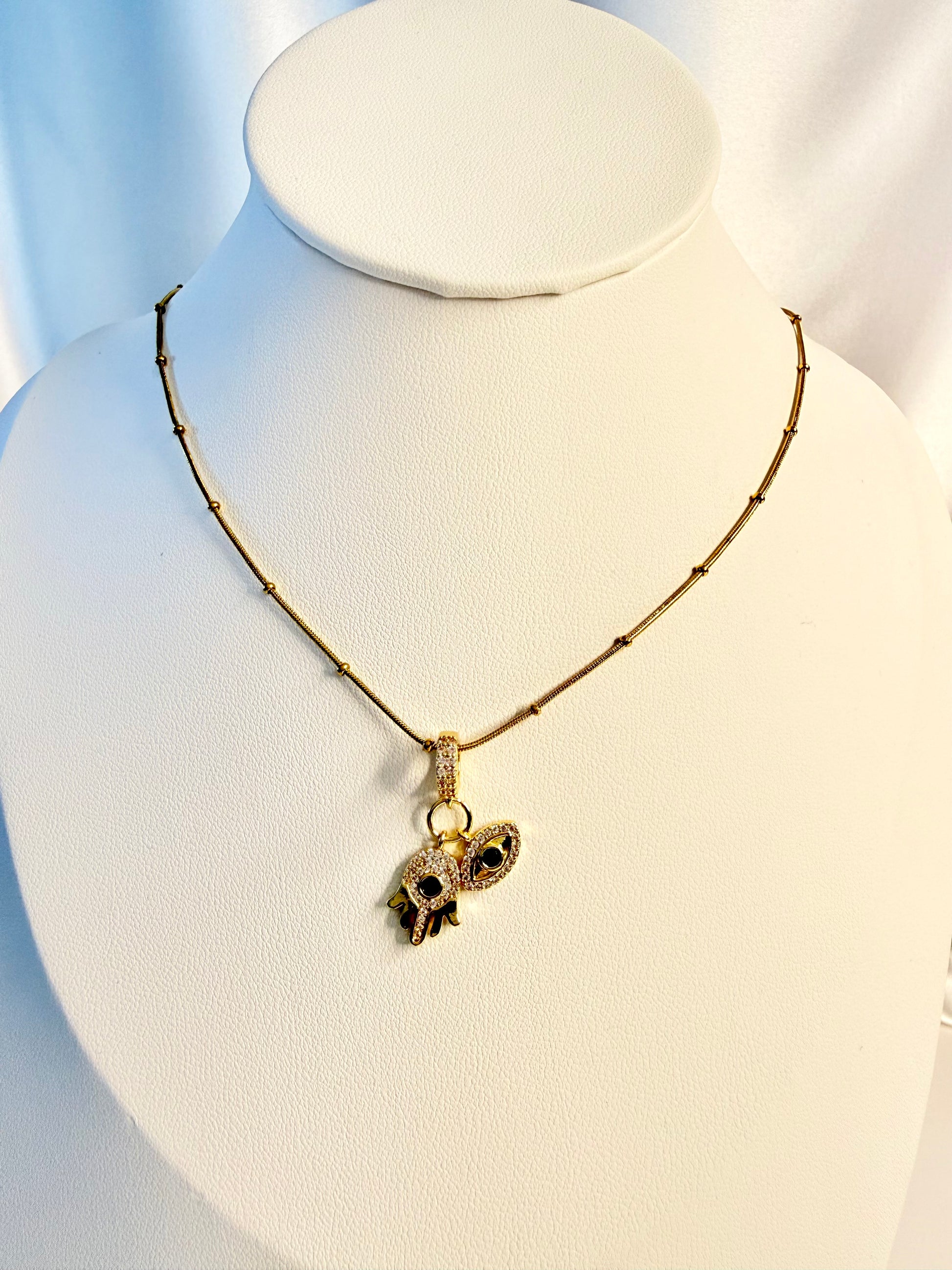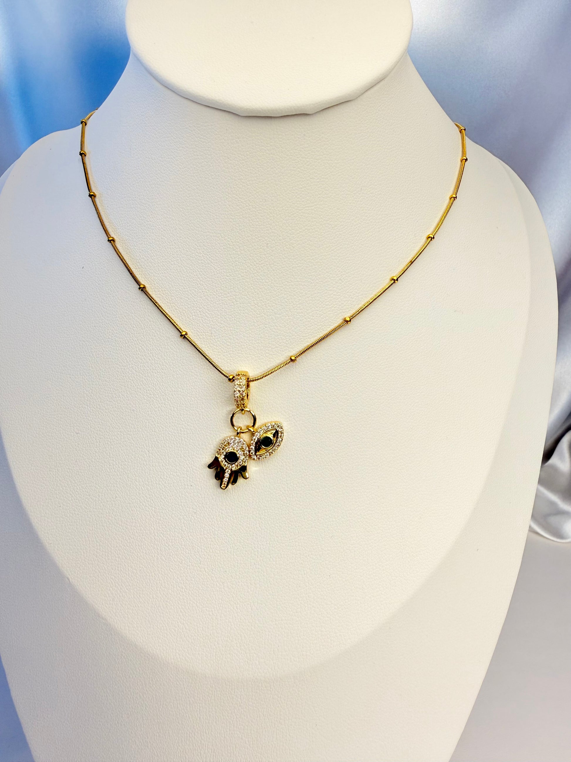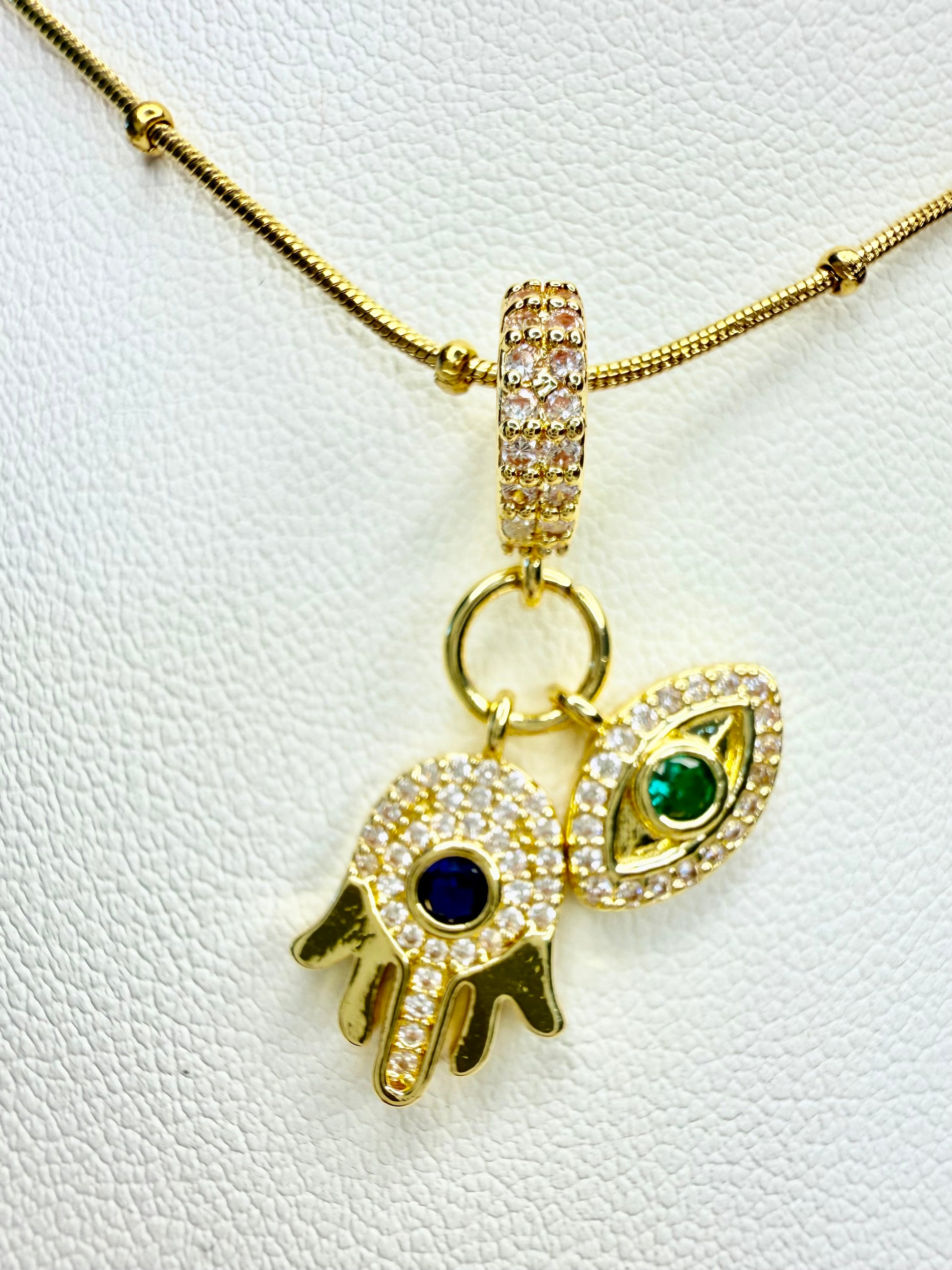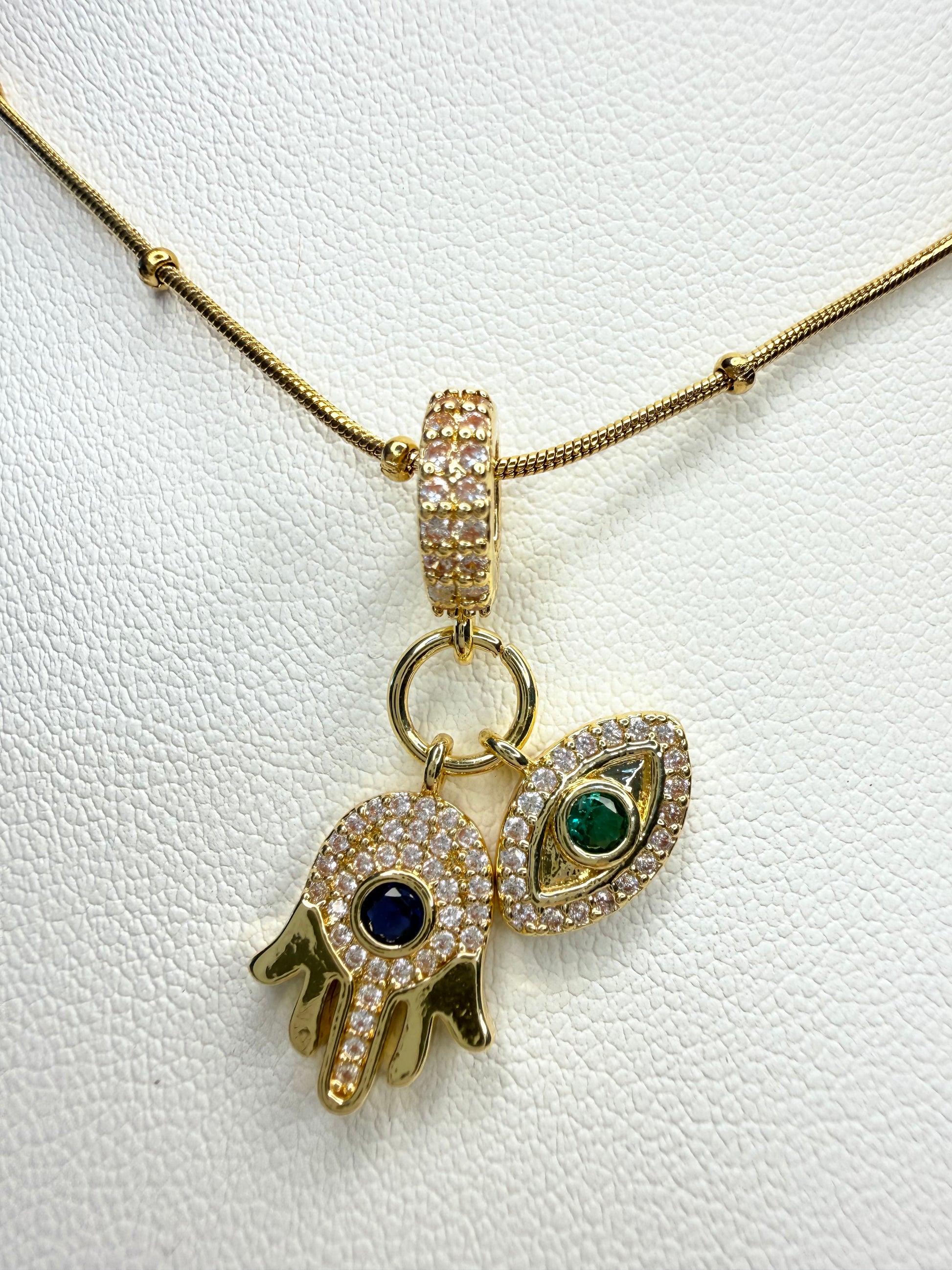 عقد ذهبي فاخر بتصميم راقٍ يجمع بين رمز العين ورمز الكف، مرصّع بأحجار لامعة مع لمسة سوداء أنيقة في مركز العين. قطعة تجمع بين الجمال والرمزية، لتمنحك إطلالة فاخرة تحمل معنى الحماية والطاقة الإيجابية.
