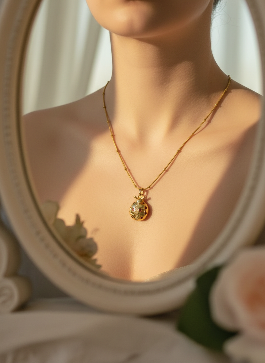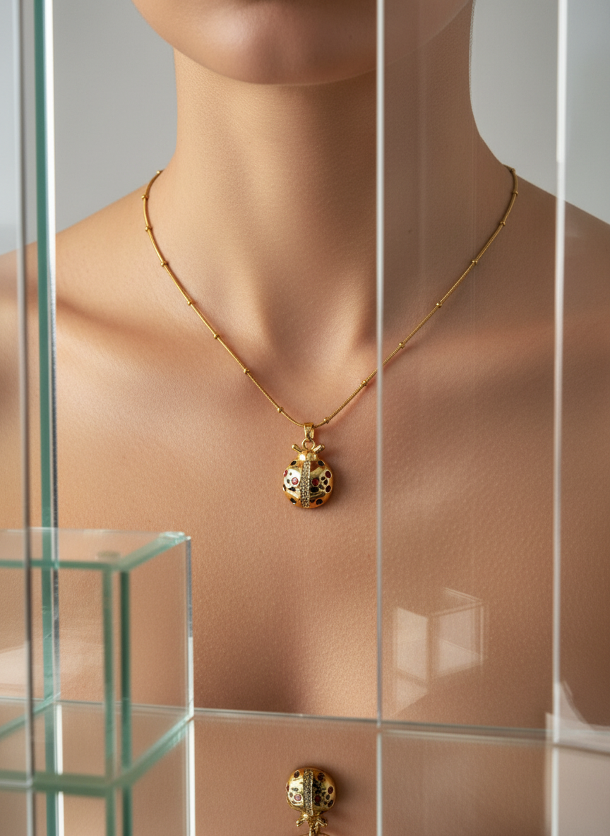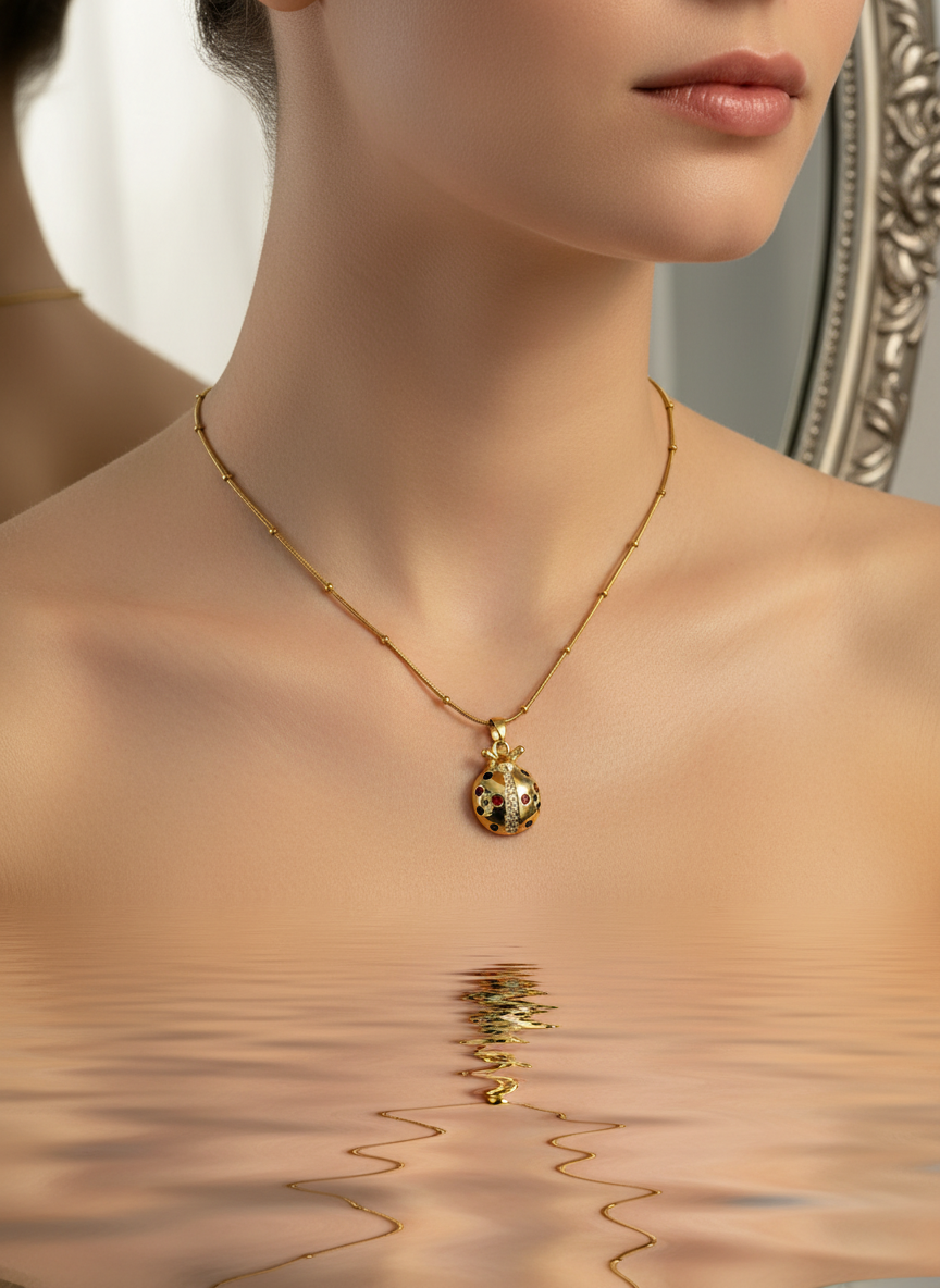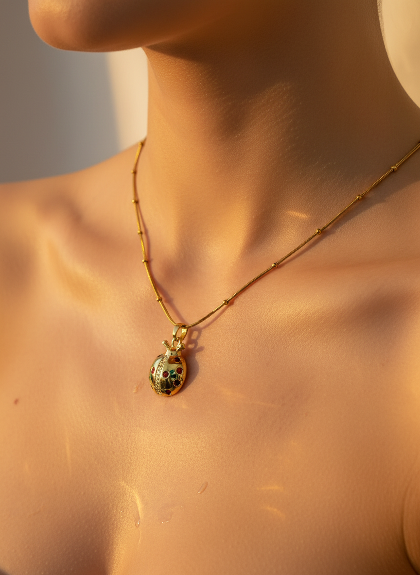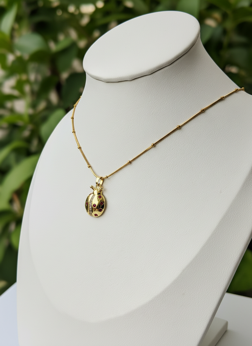 عقد ذهبي ناعم بتصميم دعسوقة أنيق وملفت، مزين بأحجار حمراء لامعة ولمسة كريستالية في المنتصف تضيف بريقًا راقيًا. قطعة تحمل معنى الحظ، التفاؤل والطاقة الإيجابية، وتناسب الإطلالات اليومية كما تشكّل هدية مميزة مليئة بالمعنى.