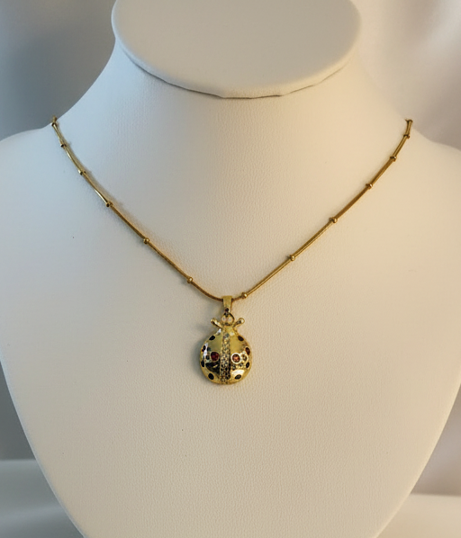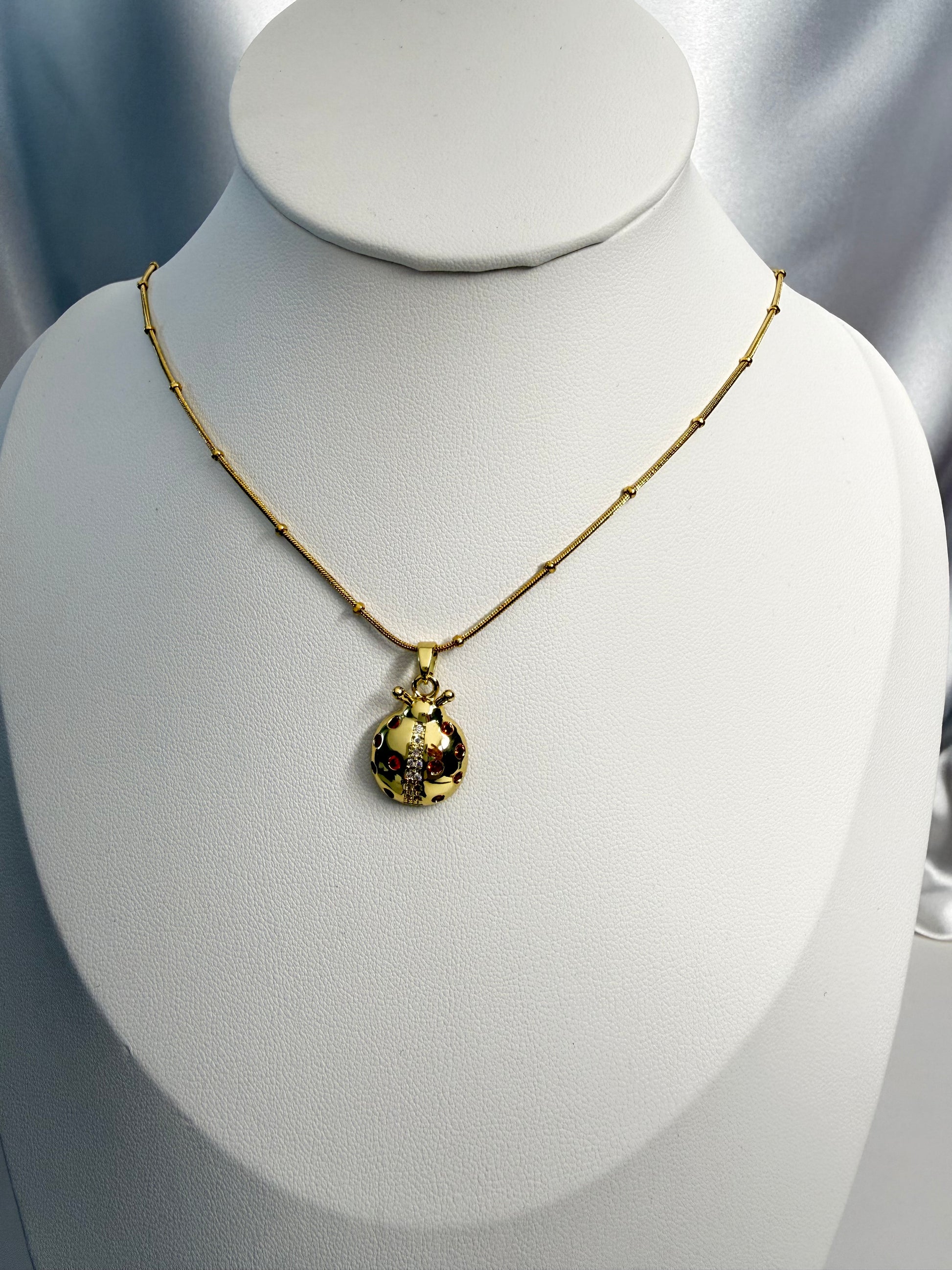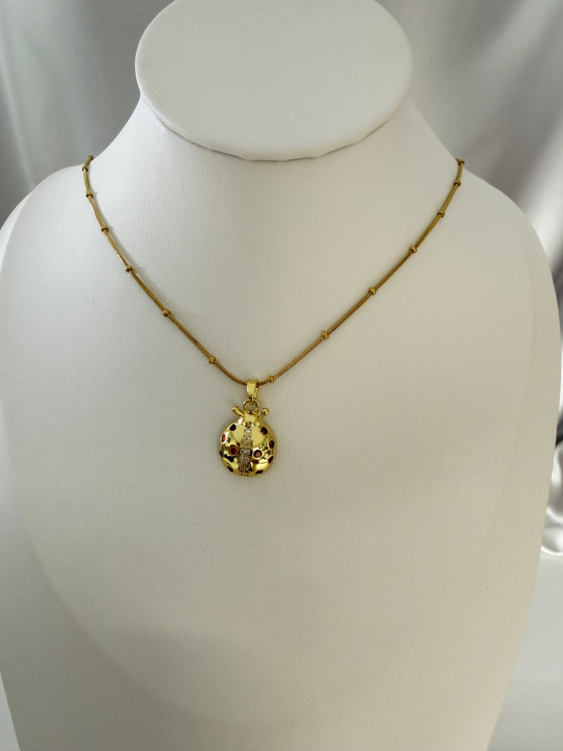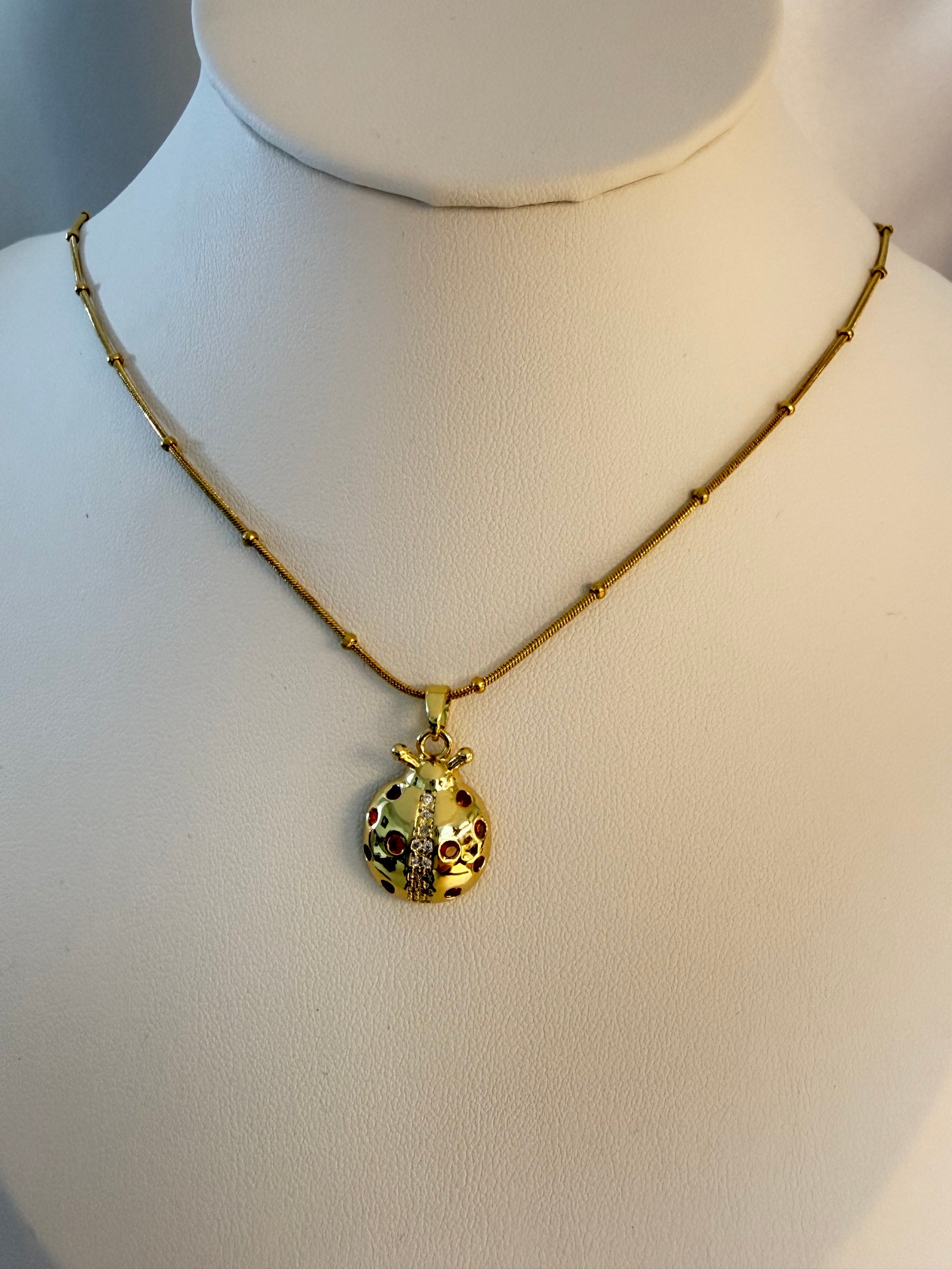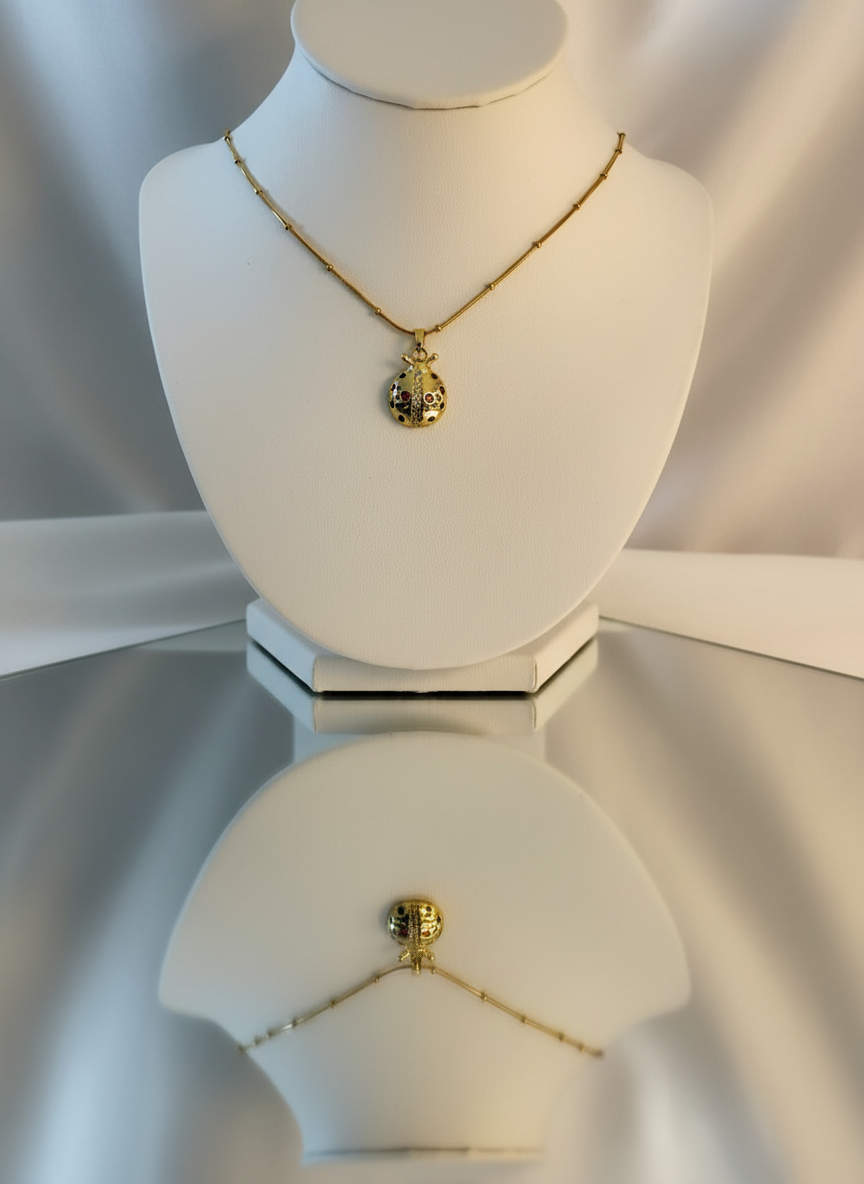 عقد ذهبي ناعم بتصميم دعسوقة أنيق وملفت، مزين بأحجار حمراء لامعة ولمسة كريستالية في المنتصف تضيف بريقًا راقيًا. قطعة تحمل معنى الحظ، التفاؤل والطاقة الإيجابية، وتناسب الإطلالات اليومية كما تشكّل هدية مميزة مليئة بالمعنى.