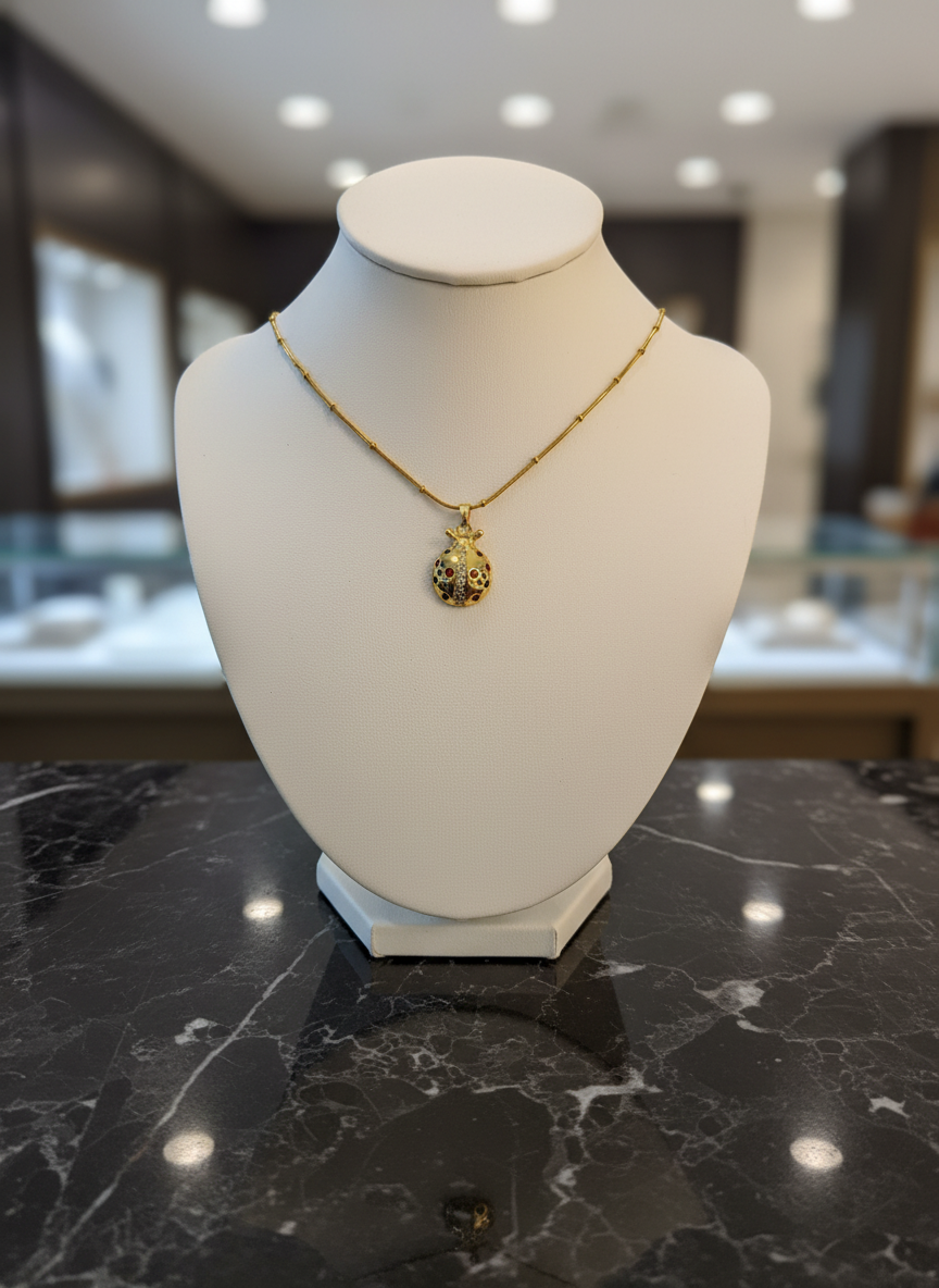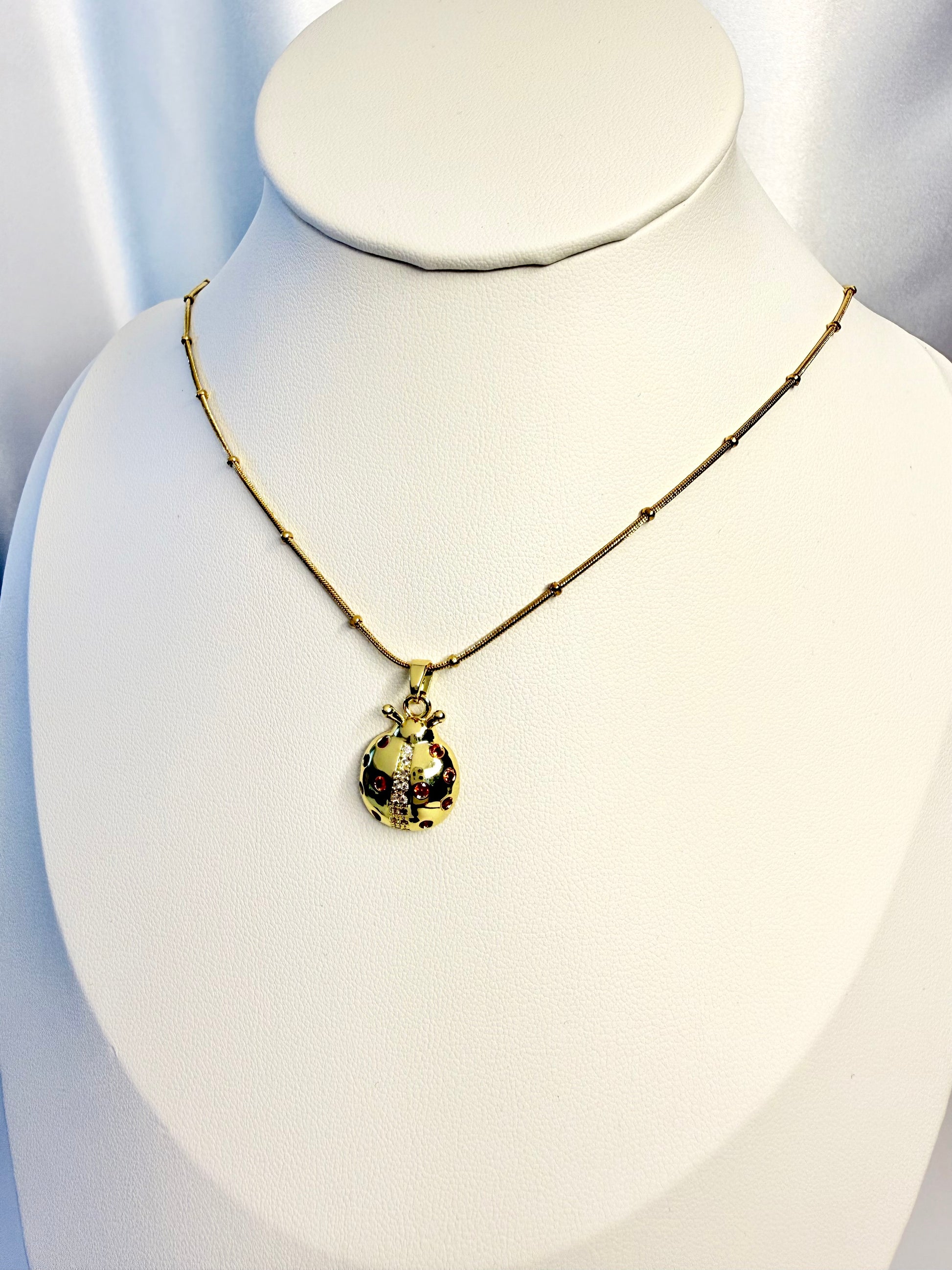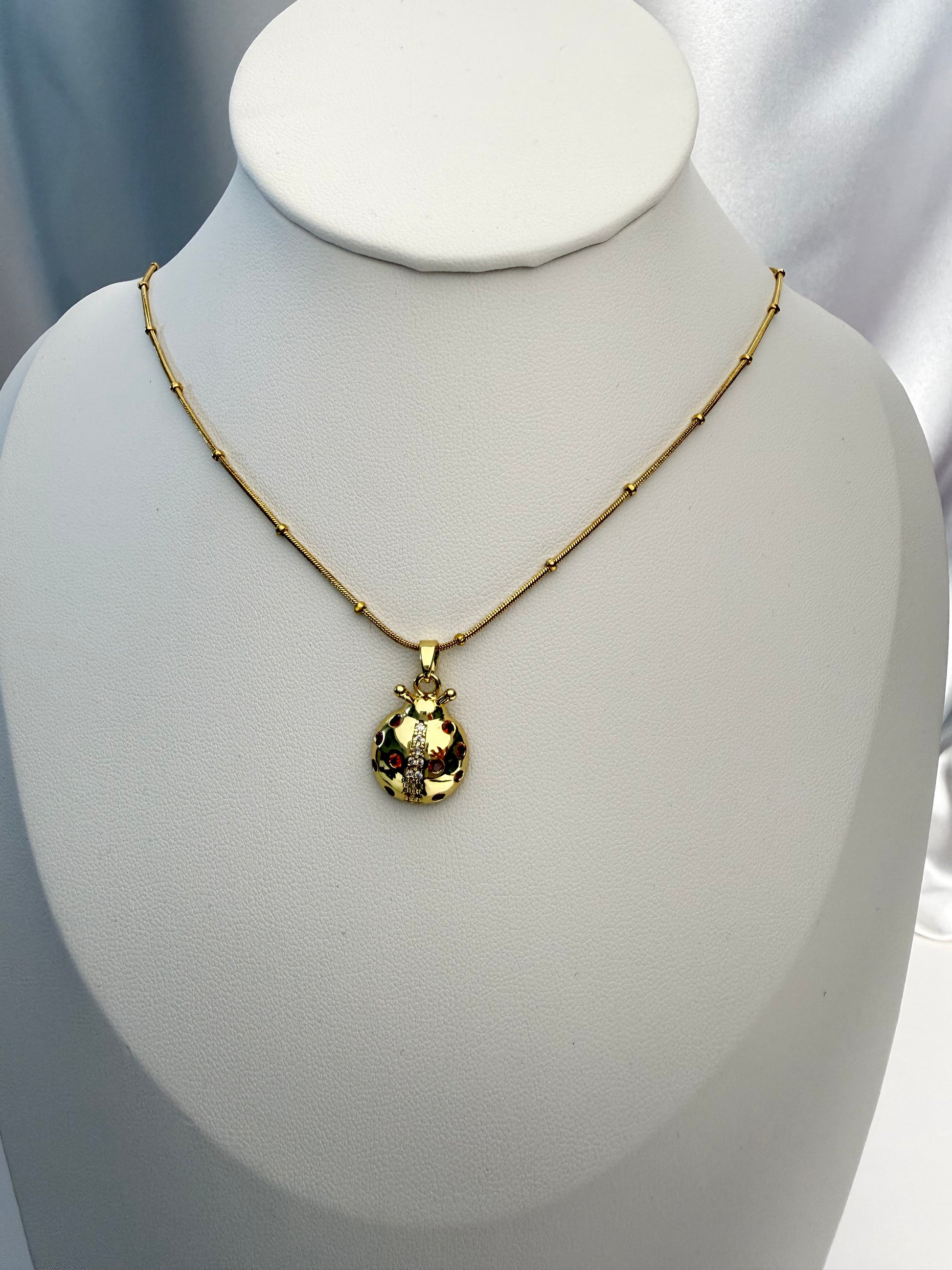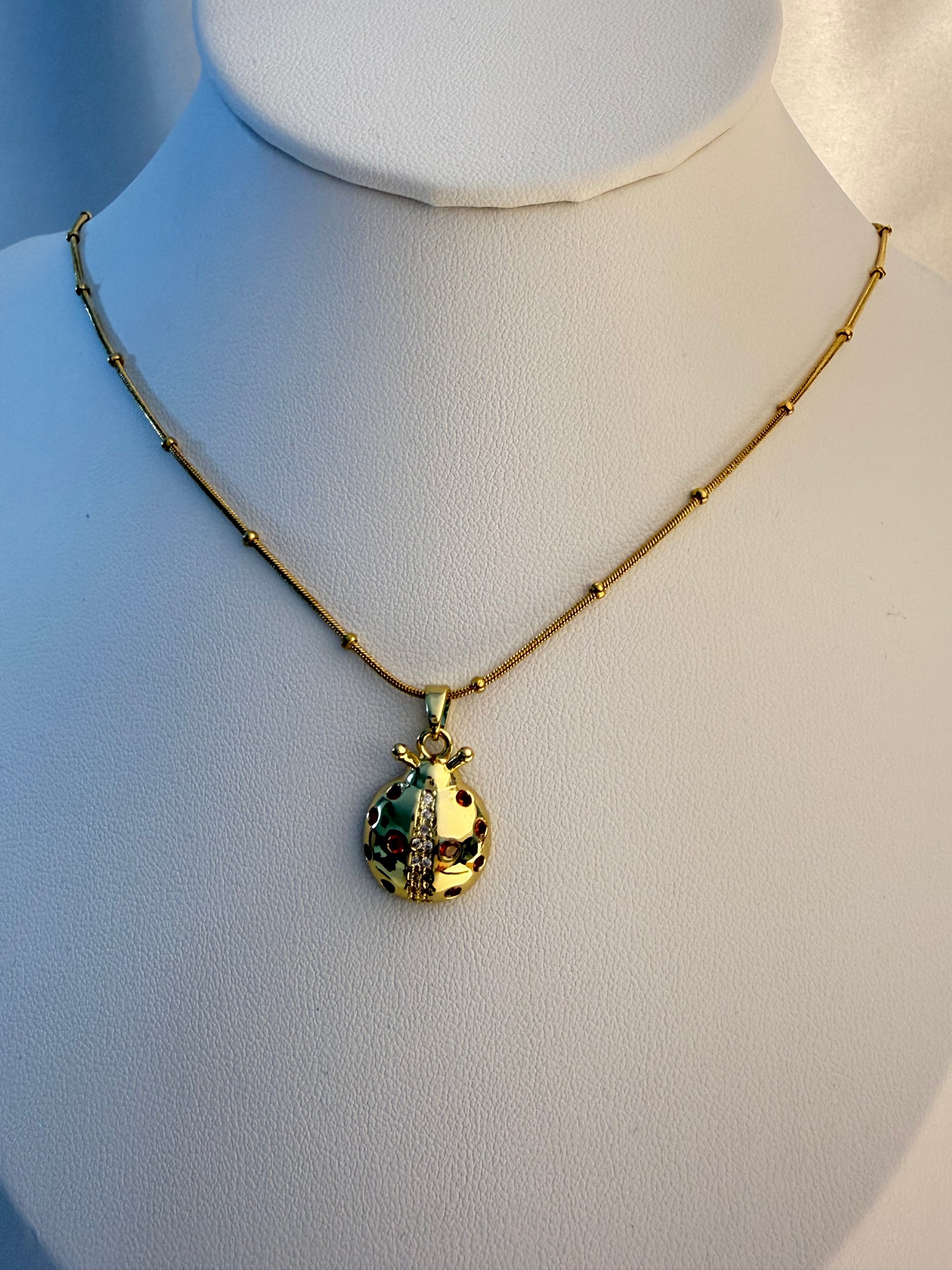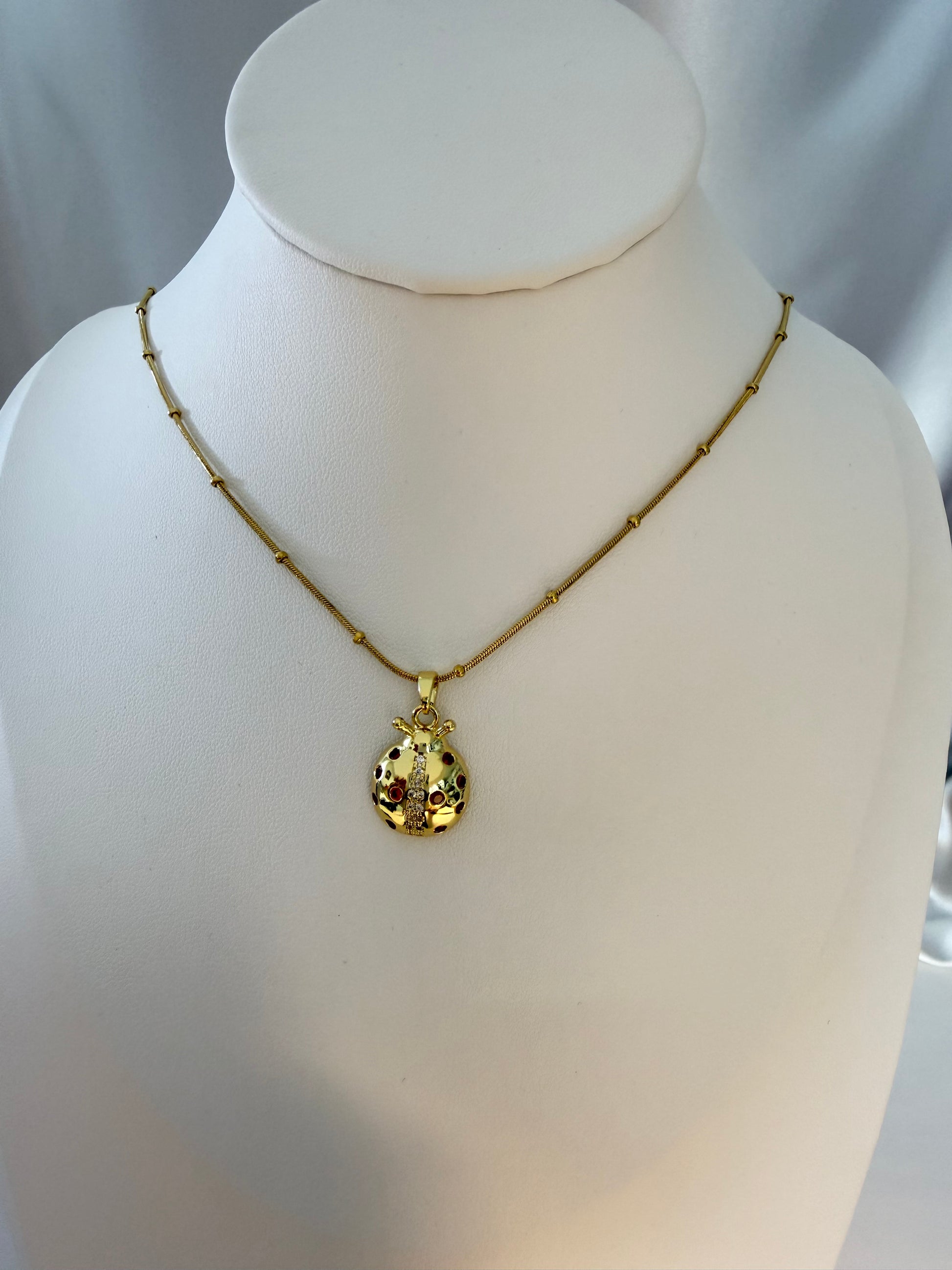 عقد ذهبي ناعم بتصميم دعسوقة أنيق وملفت، مزين بأحجار حمراء لامعة ولمسة كريستالية في المنتصف تضيف بريقًا راقيًا. قطعة تحمل معنى الحظ، التفاؤل والطاقة الإيجابية، وتناسب الإطلالات اليومية كما تشكّل هدية مميزة مليئة بالمعنى.