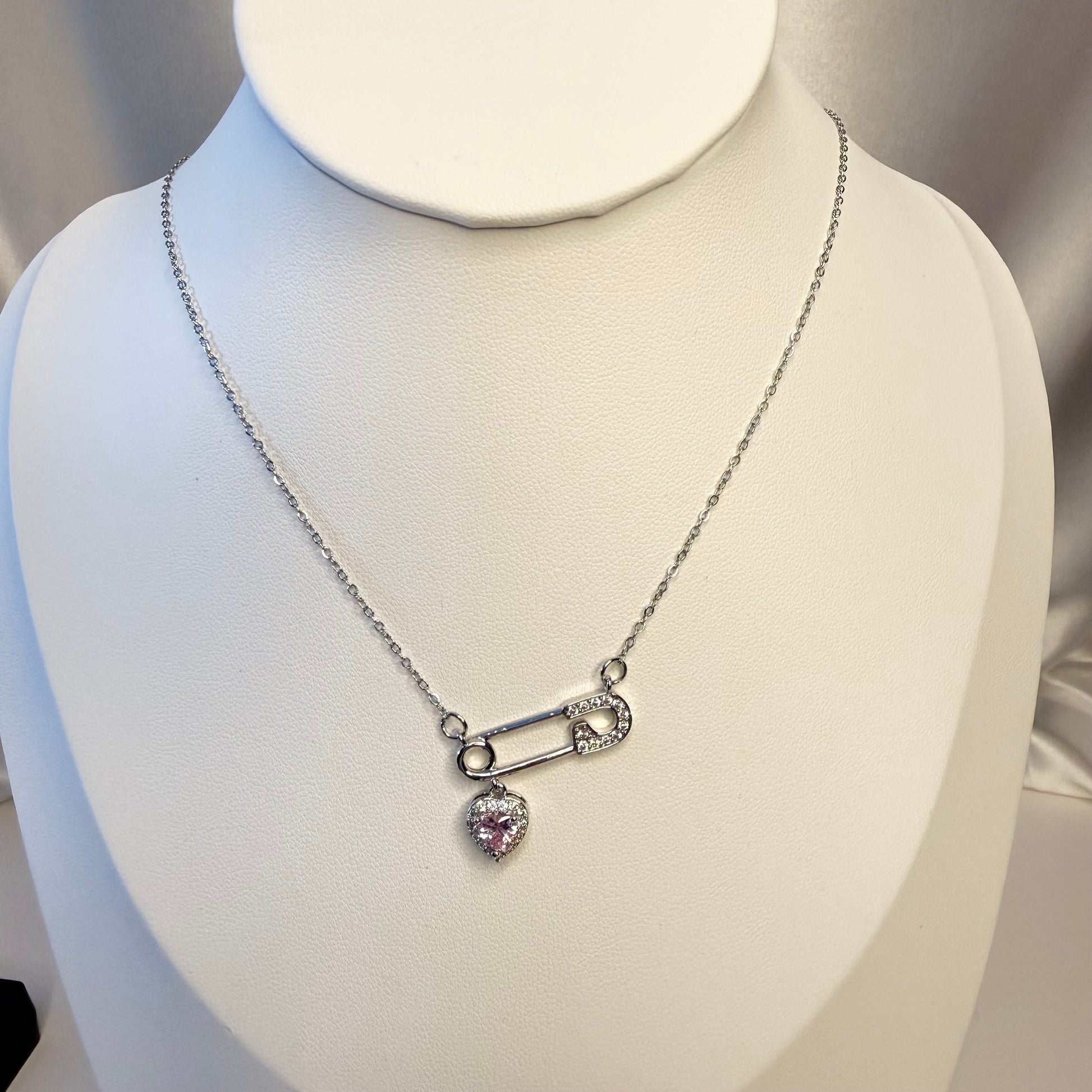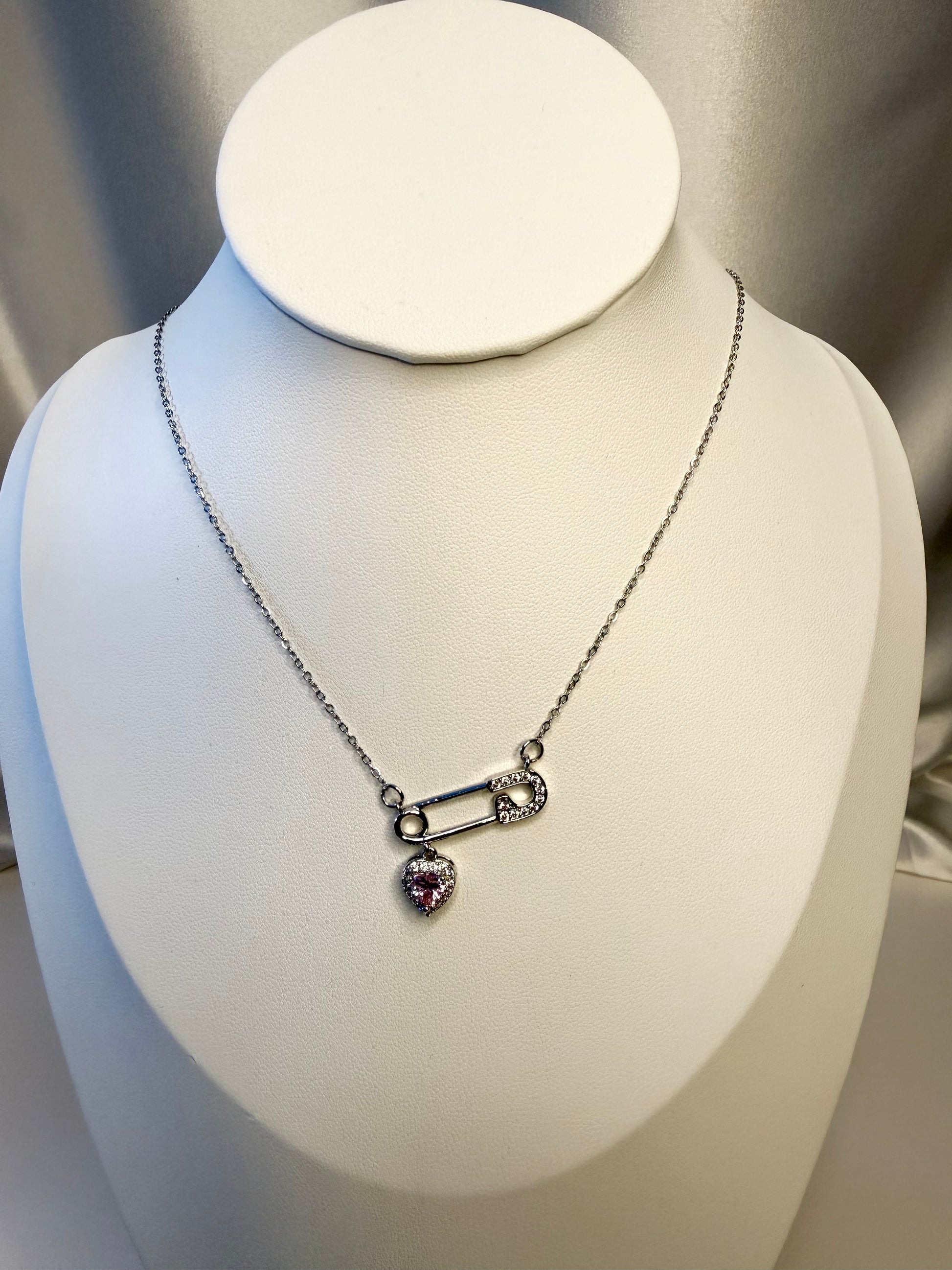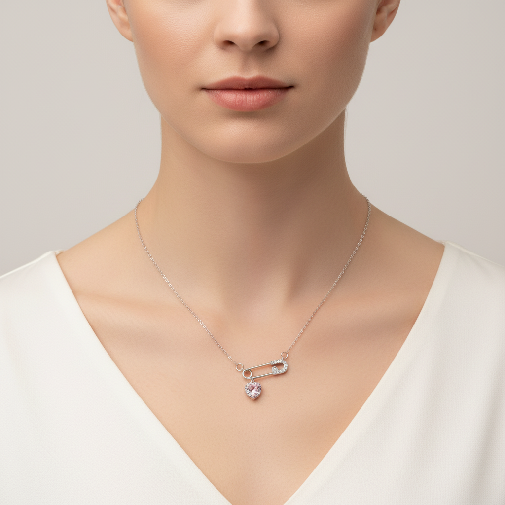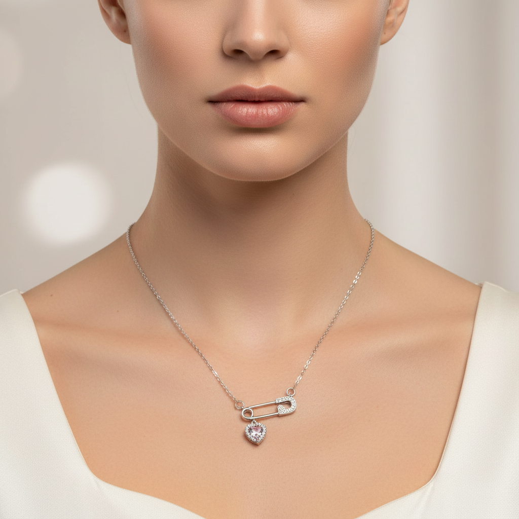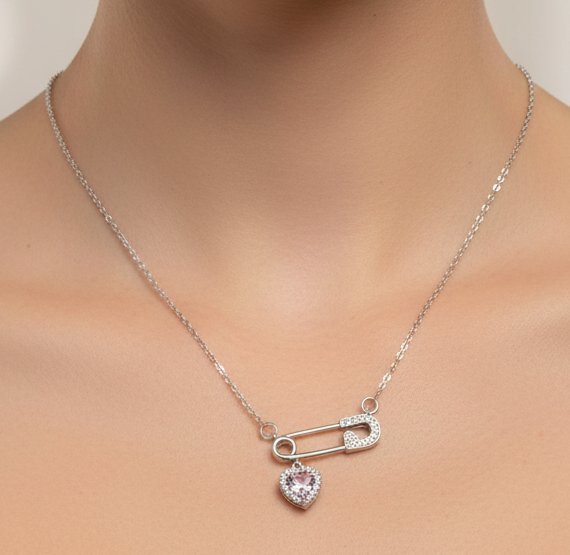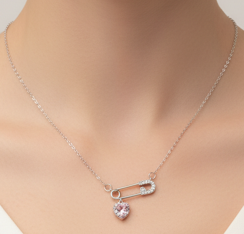 عقد أنيق بلون فضي بتصميم دبوس عصري مرصّع بالأحجار اللامعة، تتدلى منه تعليقة قلب وردي جذابة، ليجسّد مزيجًا فريدًا بين القوة والأنوثة ولمسة حب ناعمة تلفت الأنظار.