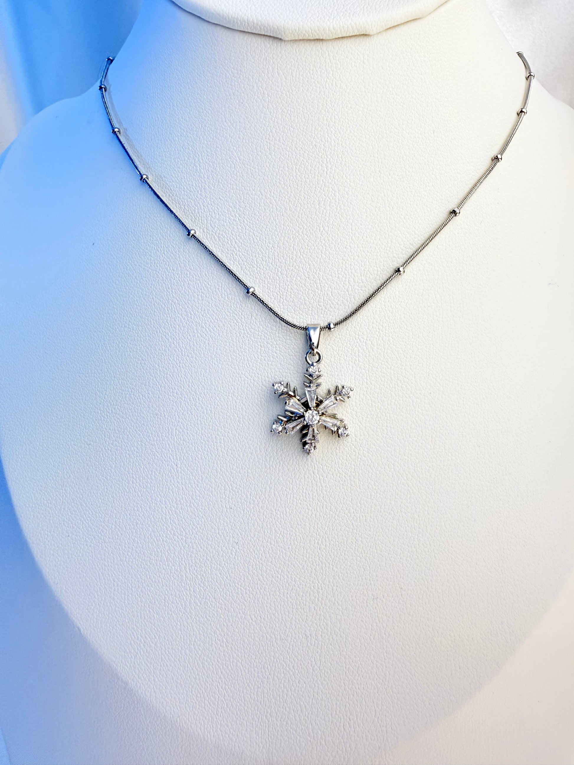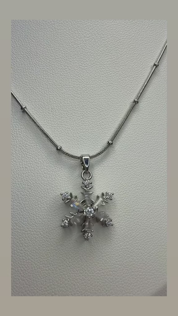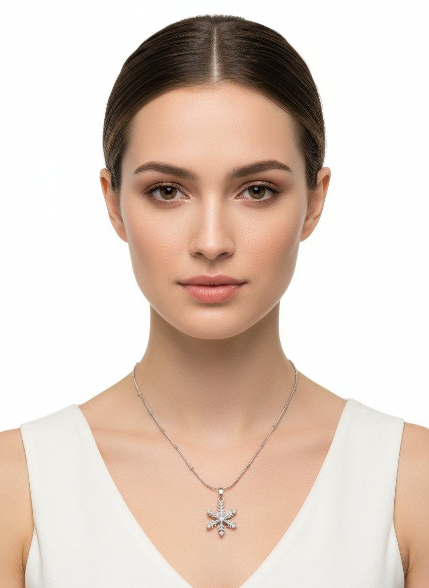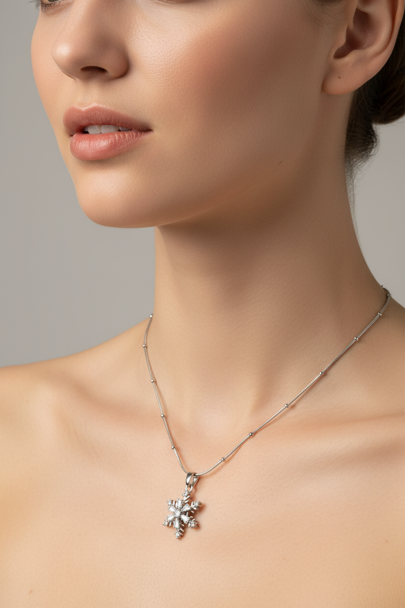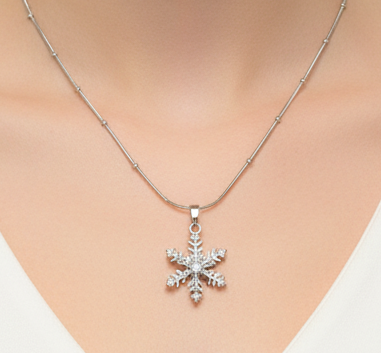 عقد فضي راقٍ بتعليقة ندفة ثلج متقنة التفاصيل، مرصّعة بأحجار لامعة تعكس الضوء بسحر ناعم. تصميم أنيق يرمز للنقاء، التفرّد، والجمال الهادئ، مناسب لكل من تحب القطع الكلاسيكية بلمسة فاخرة.