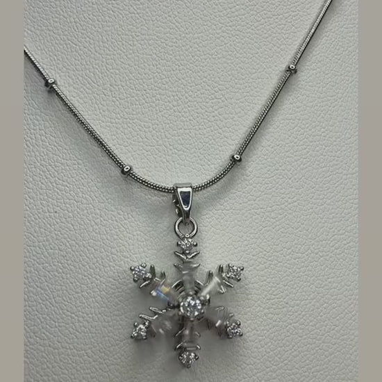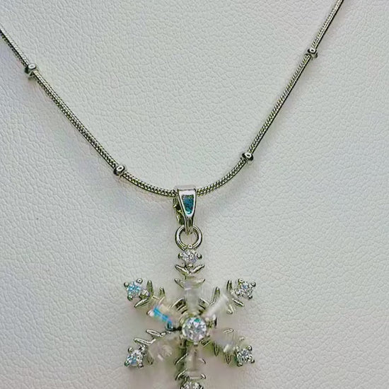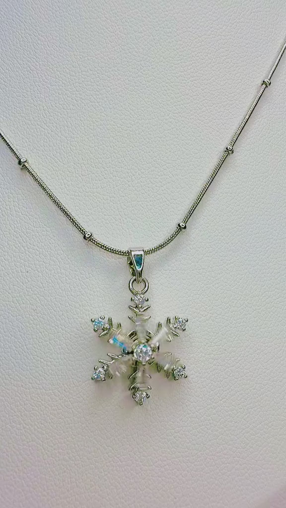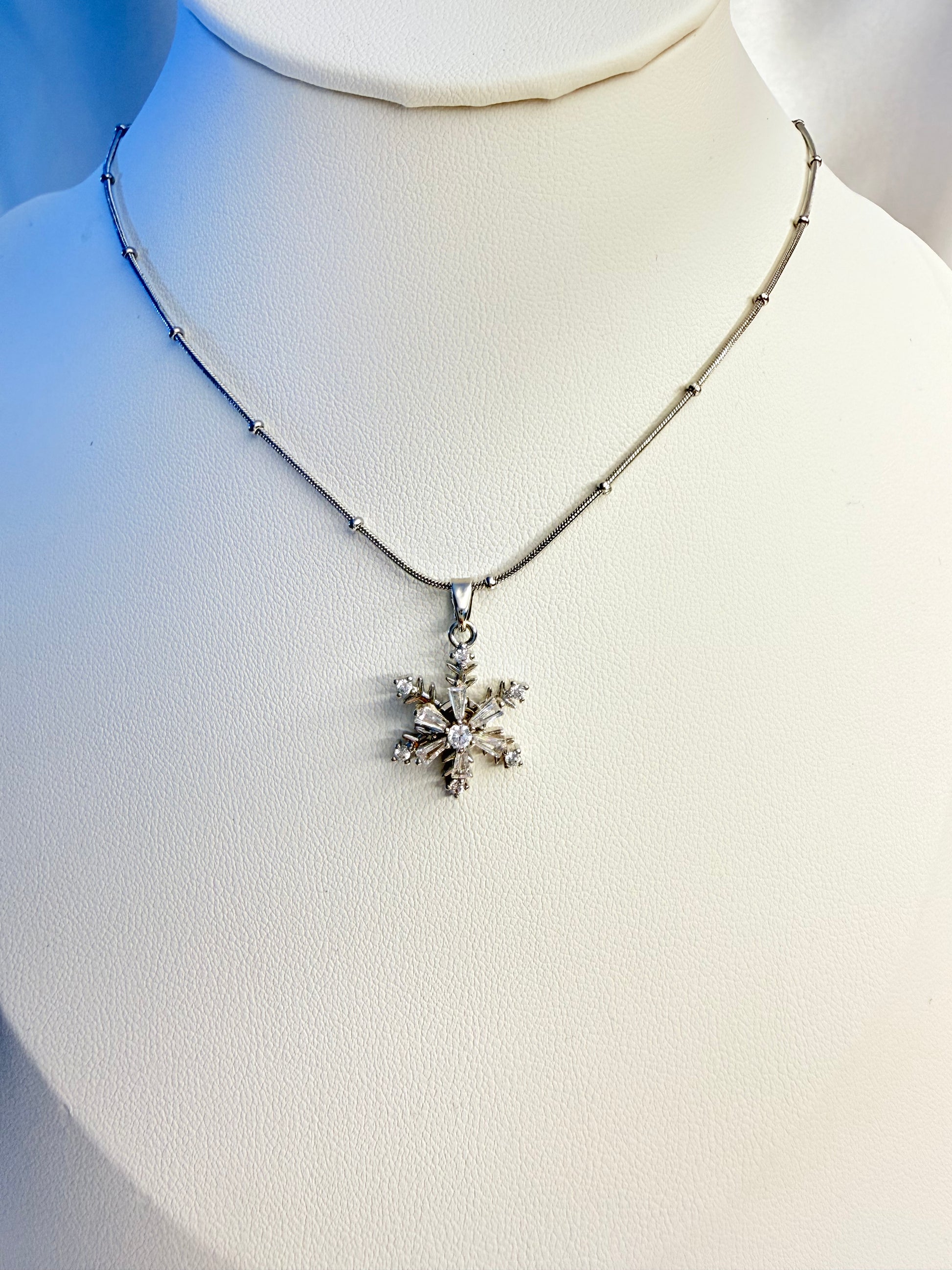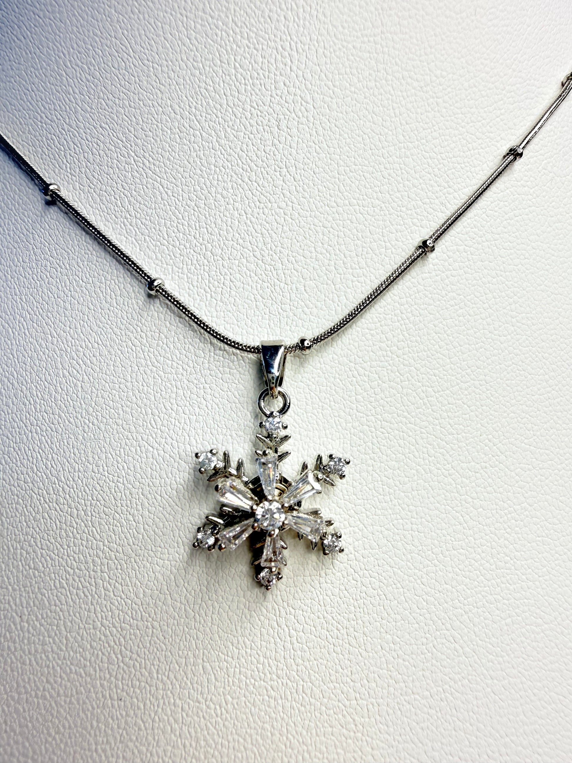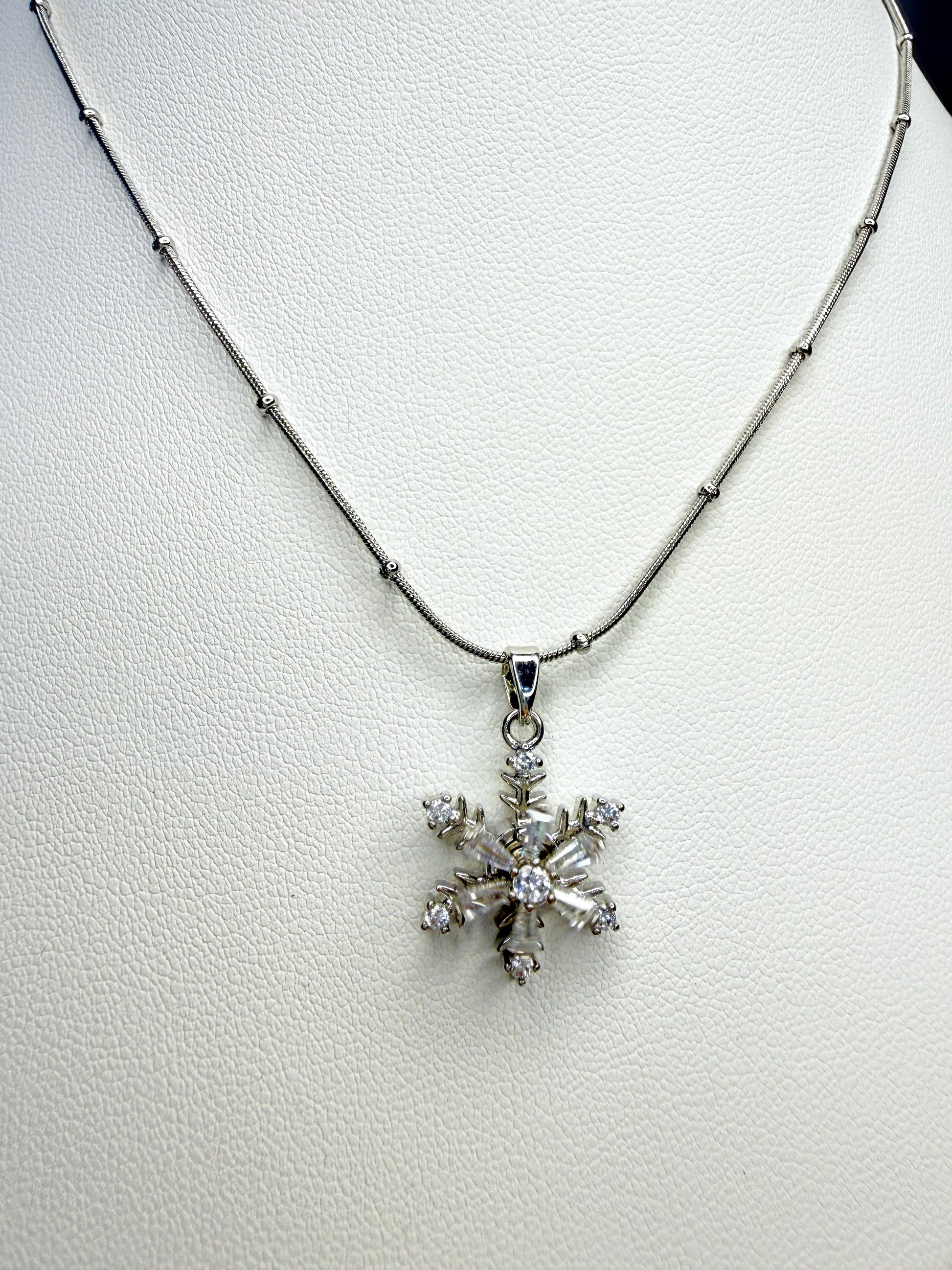 عقد فضي راقٍ بتعليقة ندفة ثلج متقنة التفاصيل، مرصّعة بأحجار لامعة تعكس الضوء بسحر ناعم. تصميم أنيق يرمز للنقاء، التفرّد، والجمال الهادئ، مناسب لكل من تحب القطع الكلاسيكية بلمسة فاخرة.