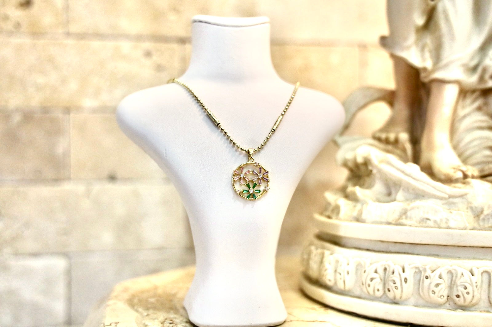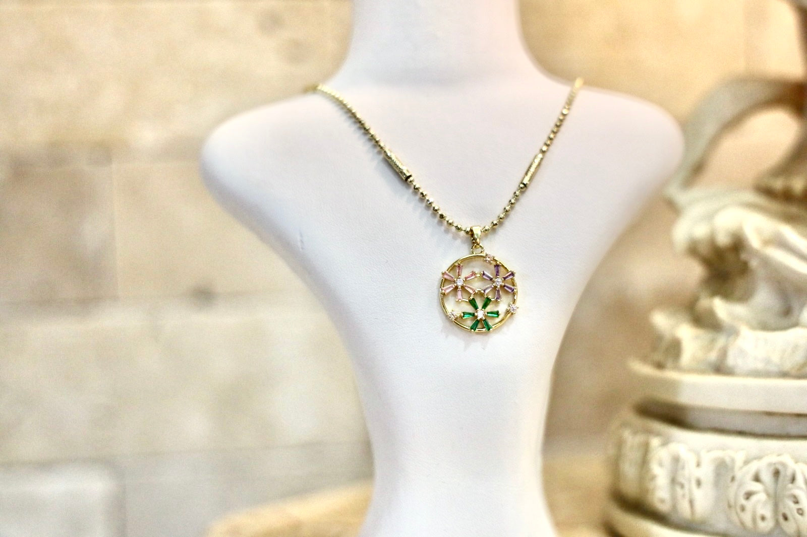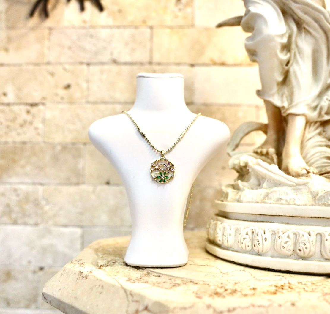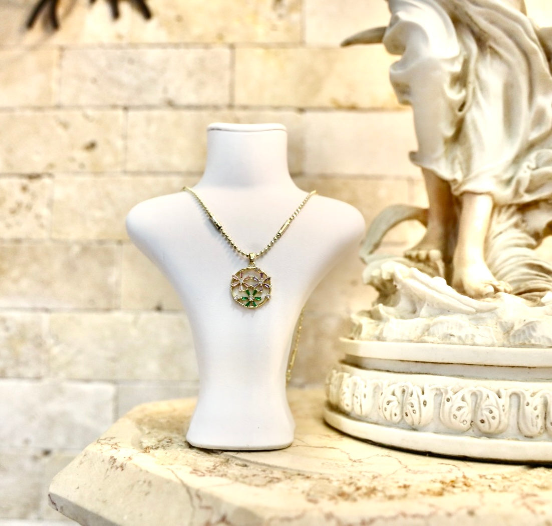 Its circular pendant is adorned with tiny floral details in soft purple and green tones, capturing the freshness of spring in every sparkle.