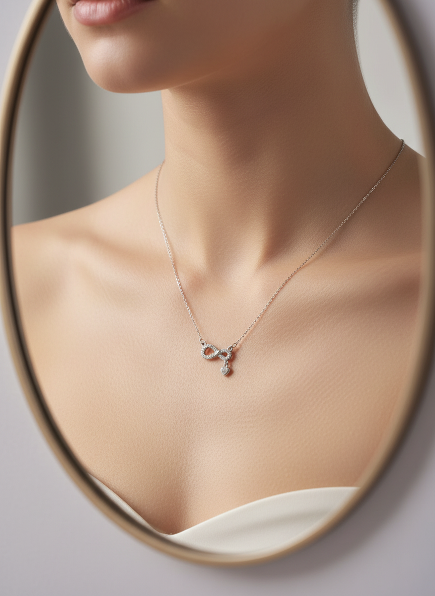 عقد أنيق بتصميم رمز اللانهاية المرصّع بفصوص لامعة، يتوسطه قلب صغير متدلّي يضيف لمسة رومانسية ناعمة. تصميمه البسيط والفخم يجعله قطعة مثالية للاستخدام اليومي أو للمناسبات الخاصة، ويعبّر عن الحب الدائم والارتباط الأبدي بأسلوب راقٍ وعصري.