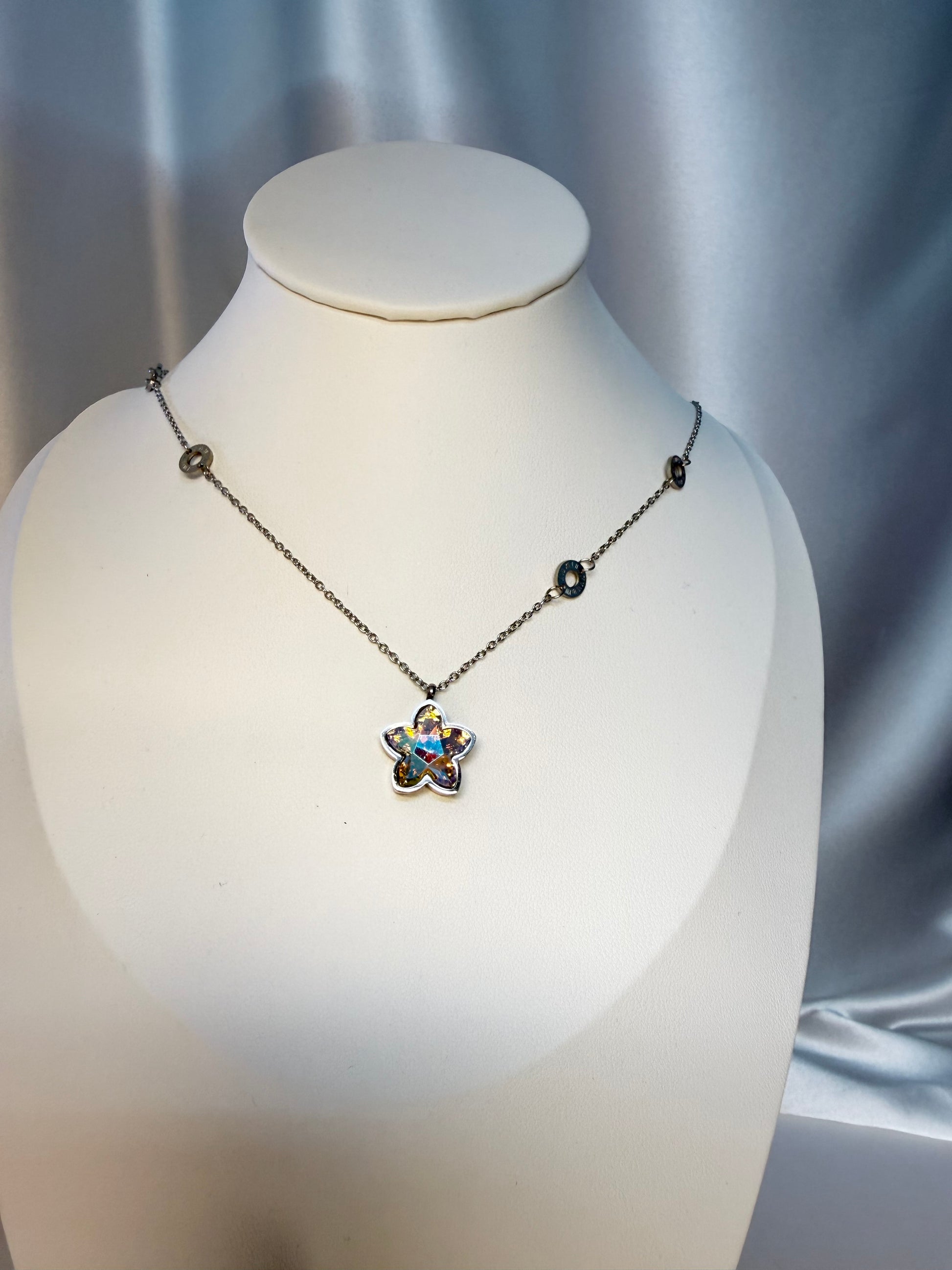 عقد أنثوي راقٍ يتوسطه تعليقة على شكل نجمة مرصّعة بكريستال متلألئ يعكس ألوانًا متعددة مع الضوء، ما يمنحه بريقًا لافتًا وحضورًا مميزًا. السلسلة الفضية مزينة بعناصر دائرية صغيرة تضيف لمسة فاخرة وعصرية، ليكون العقد قطعة مثالية للإطلالات اليومية والمناسبات الخاصة.