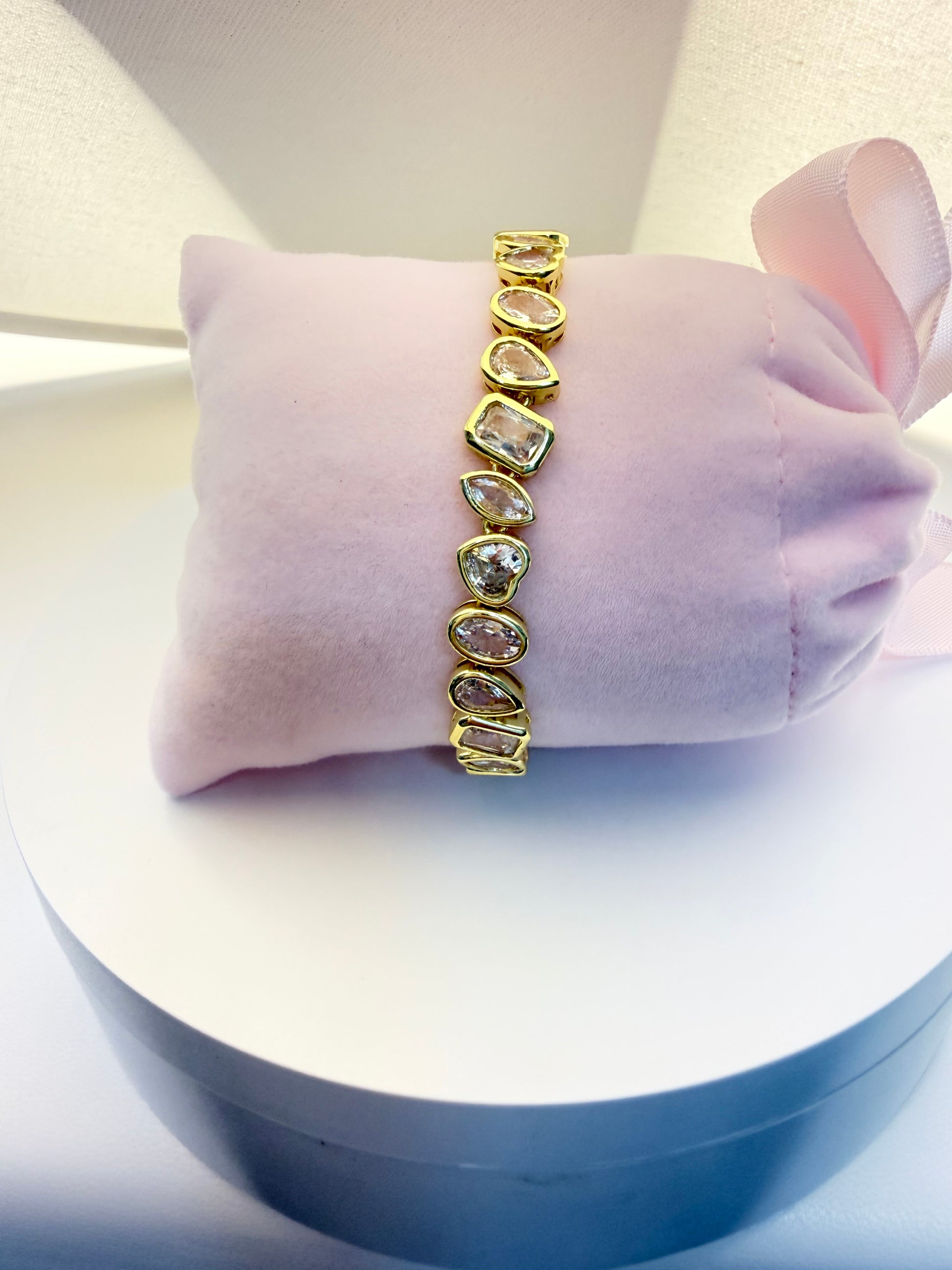 An elegant gold-tone bracelet featuring a refined mix of clear stones in various geometric shapes, including oval, pear, square, and heart cuts.