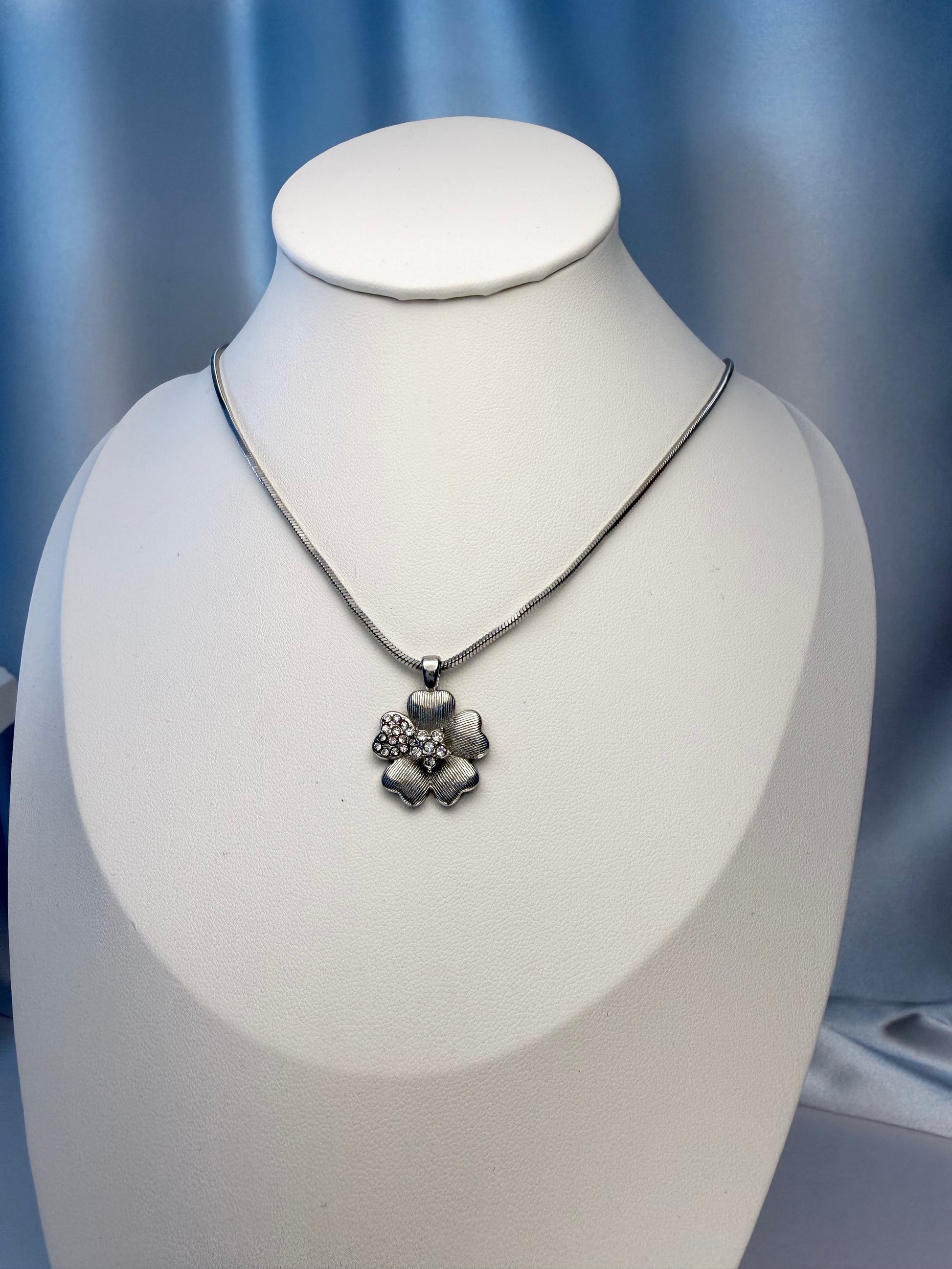 عقد أنثوي بتصميم زهرة ناعم، يجمع بين البساطة والرقي. تتوسط القلادة زهرة ذهبية بتفاصيل محفورة بعناية، مزينة بأحجار لامعة تضيف بريقًا راقيًا دون مبالغة. قطعة مثالية لإطلالة يومية أنيقة أو لمسة فخمة في المناسبات الخاصة.