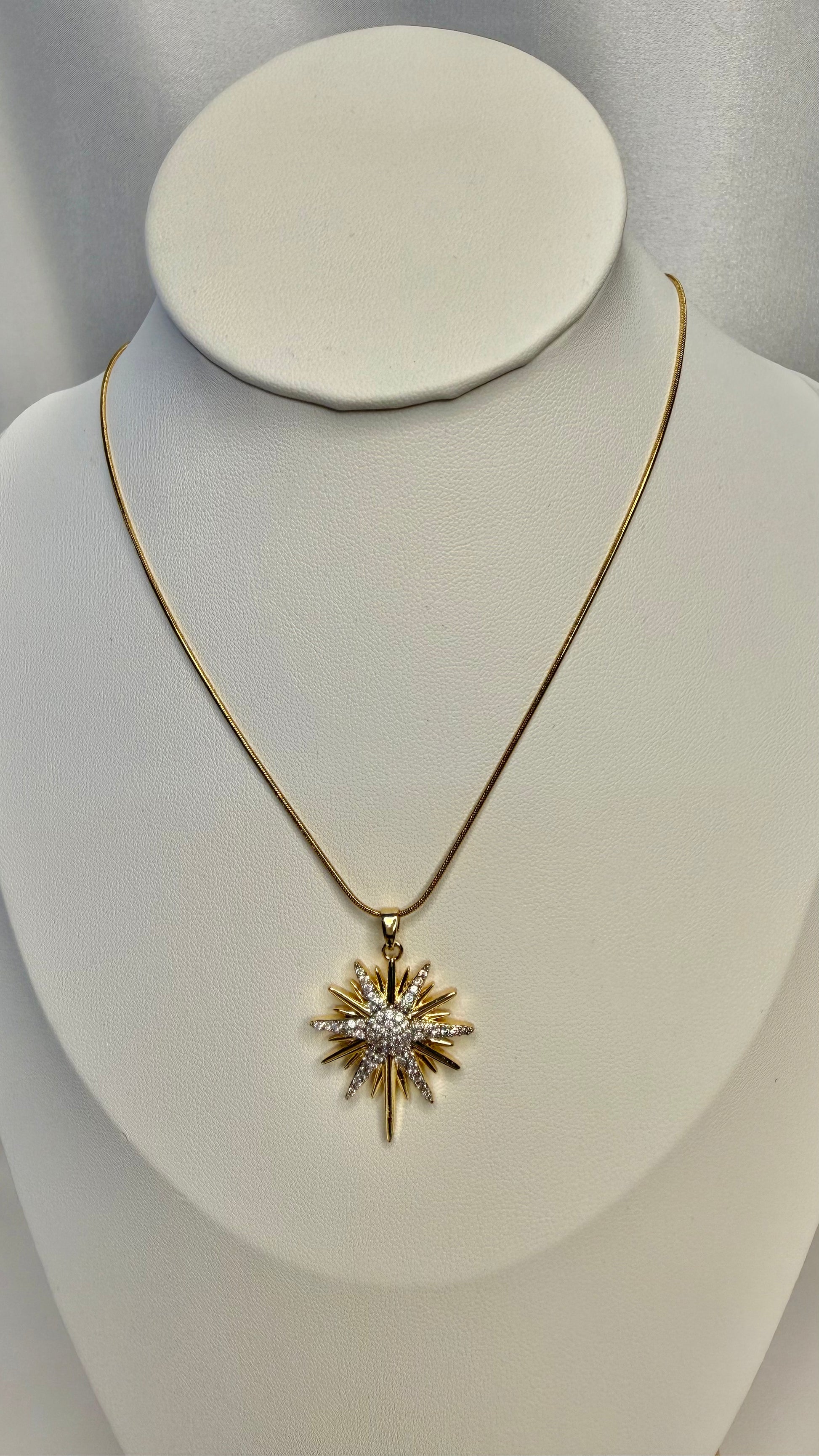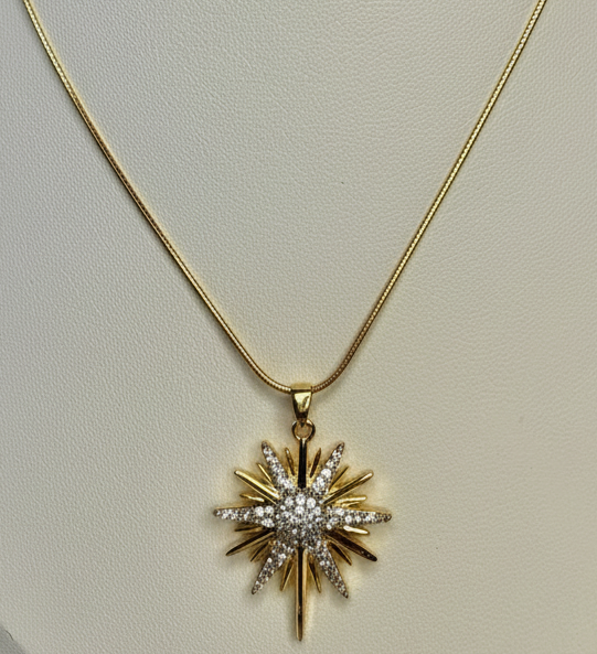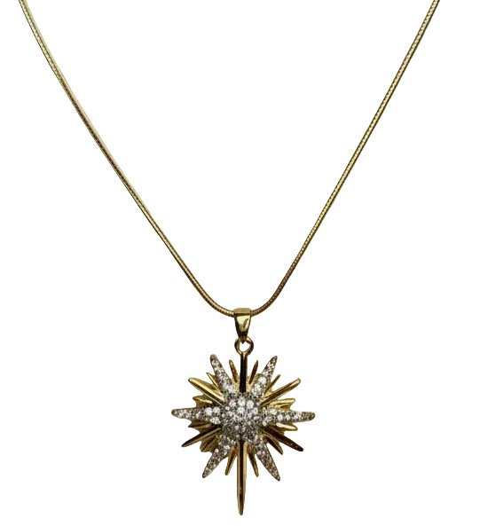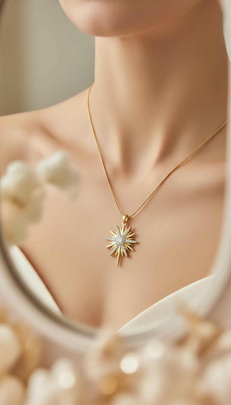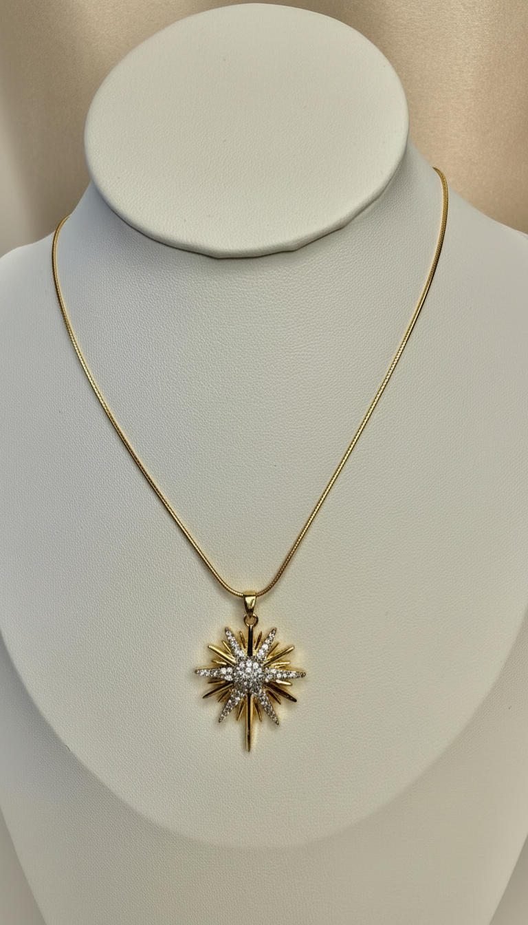 عقد أنيق بتصميم نجمة مشعّة، يجمع بين البساطة والفخامة ليمنحك لمسة راقية تبرز جمال إطلالتك في كل مناسبة. قطعة لافتة تعكس الضوء وتضيف إحساسًا بالفخامة والتميّز.